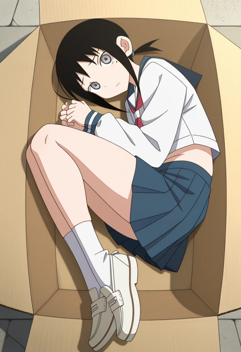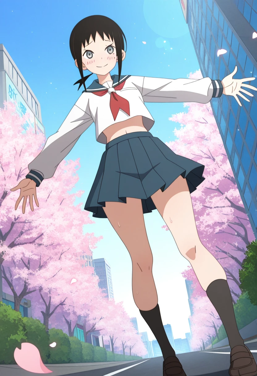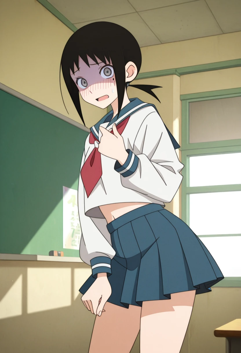school uniform, serafuku, blue sailor collar, red neckerchief, long sleeves, midriff, blue pleated skirt, socks, loafers,