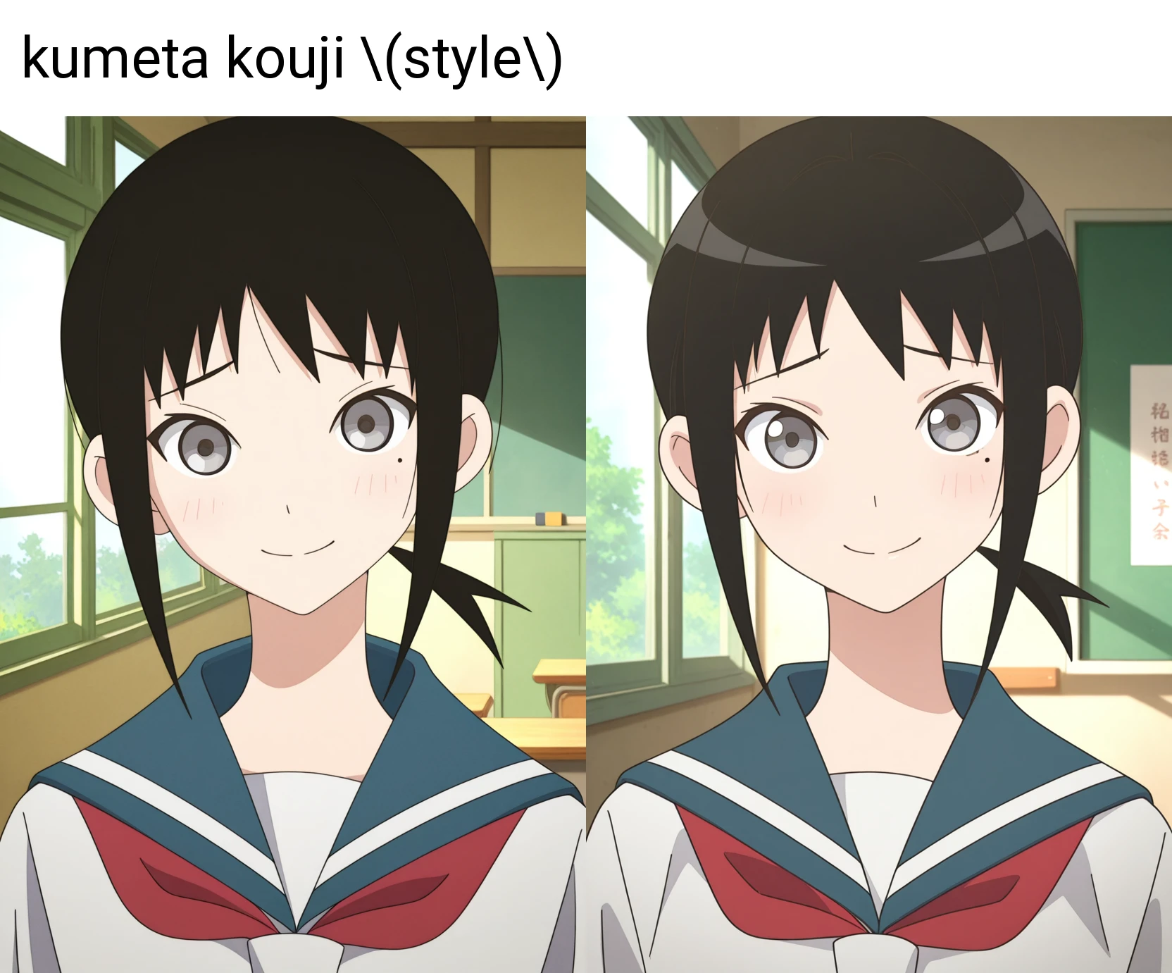 プロンプトに"kumeta kouji \(style\)"を追加する方が、再現度が高くなるようです。