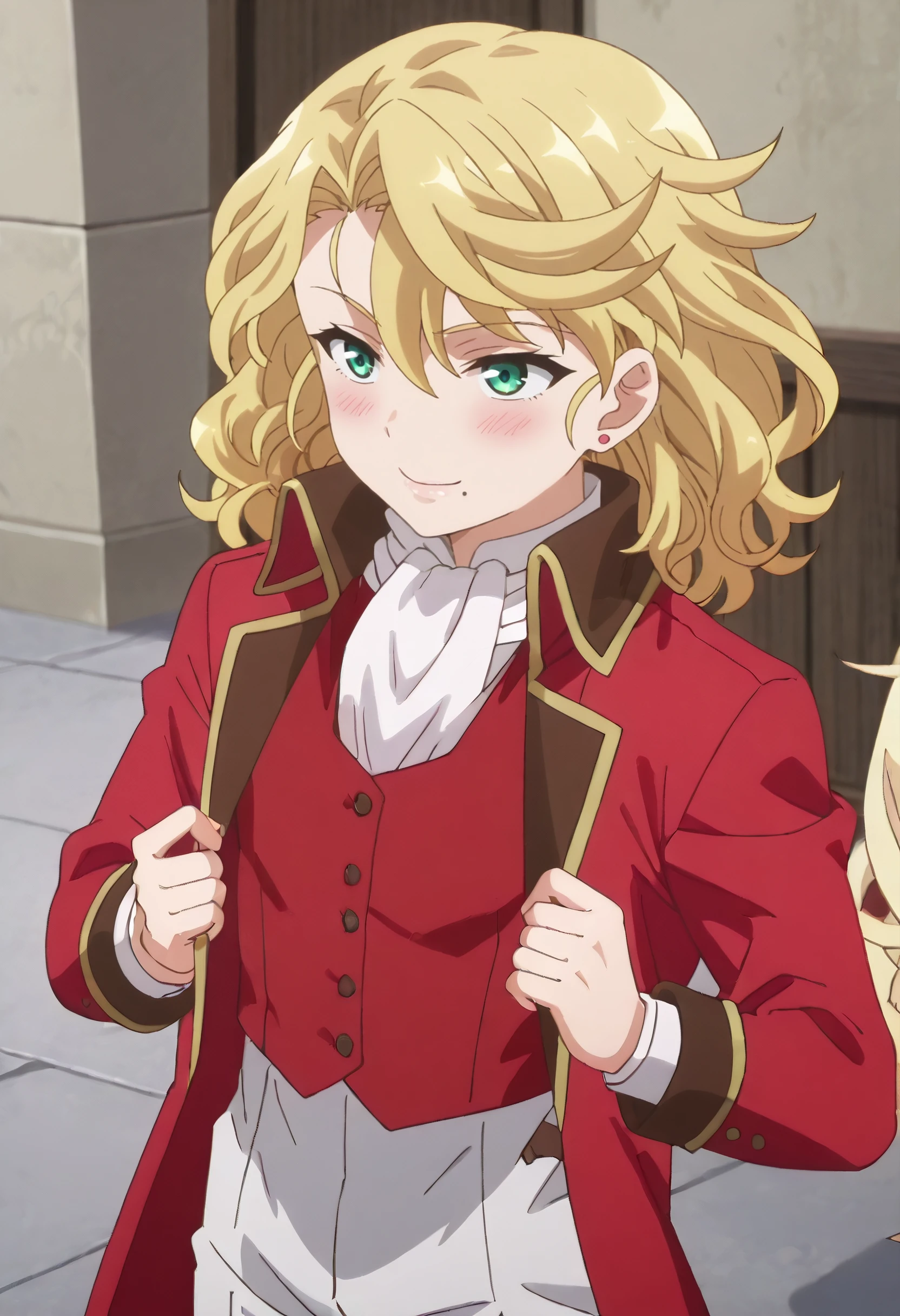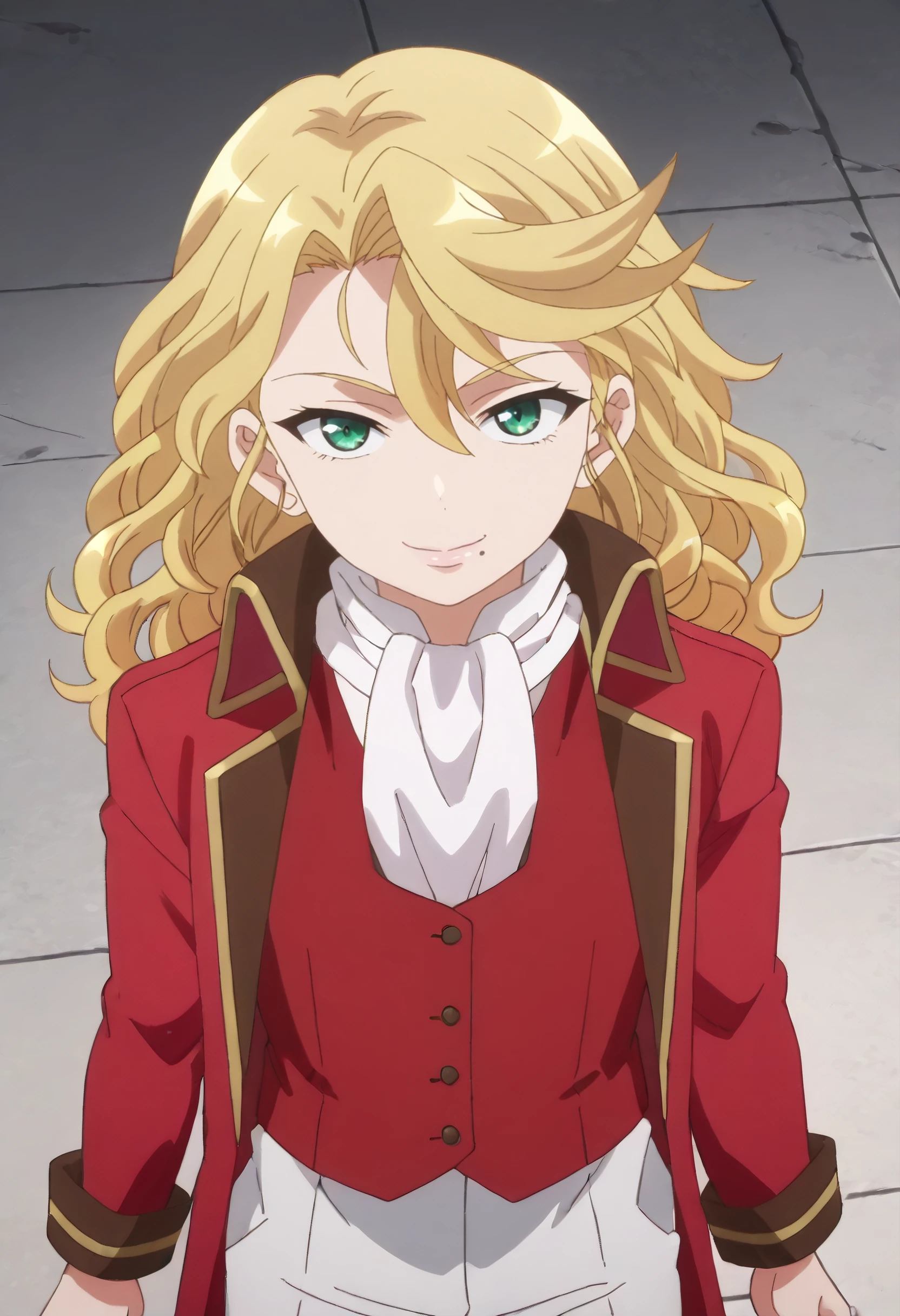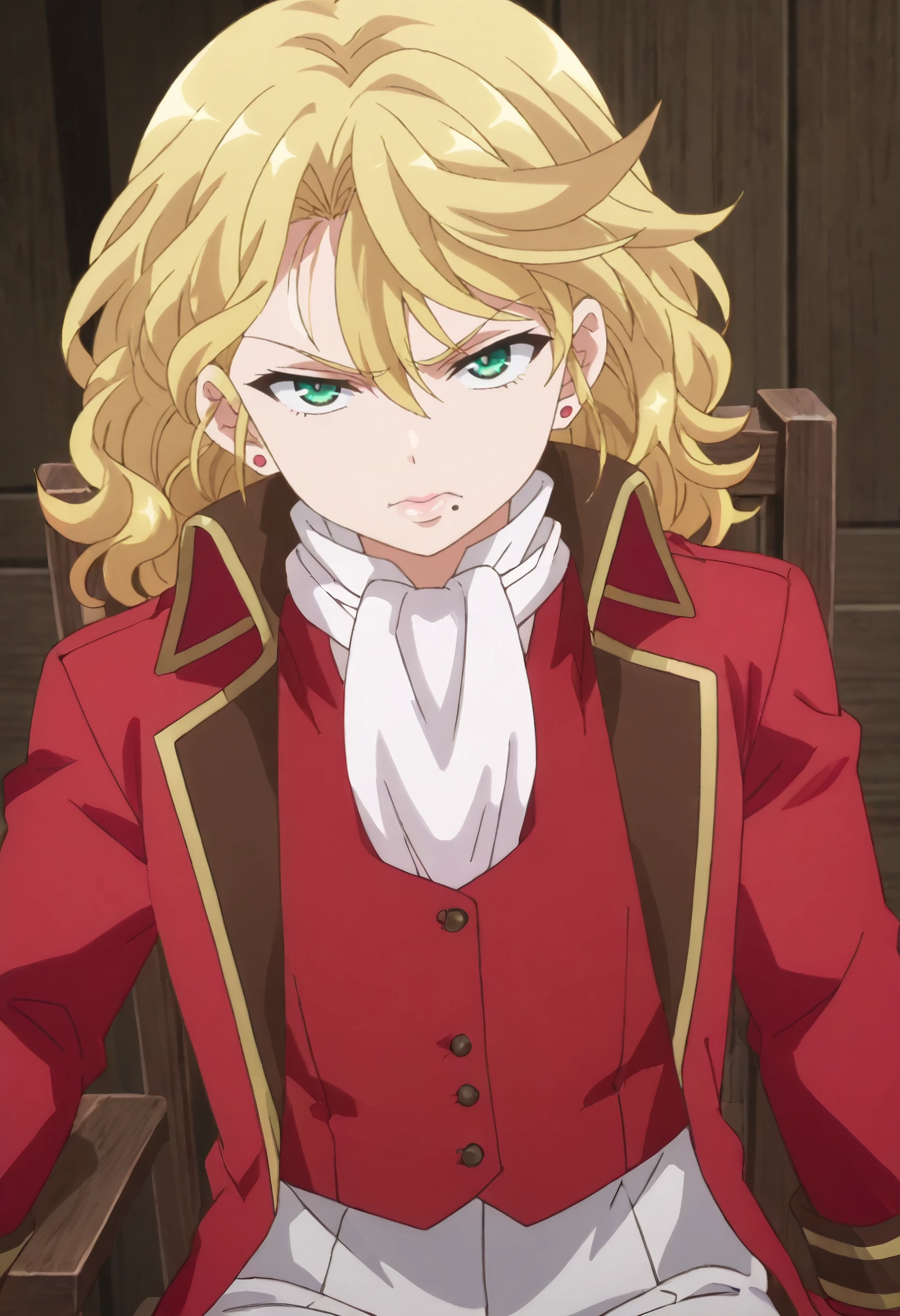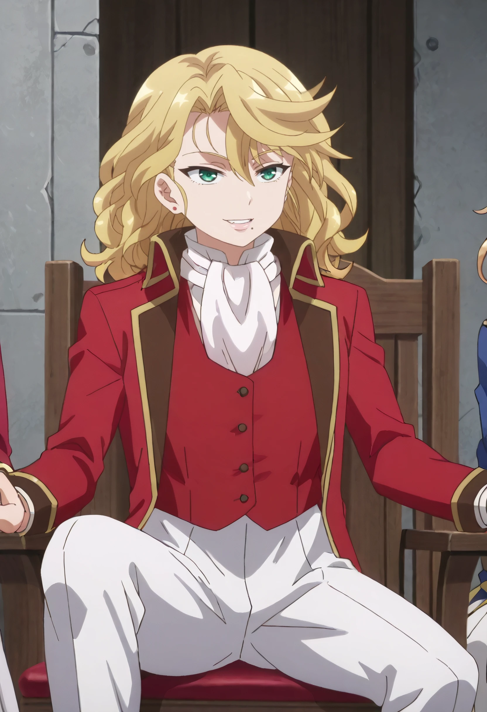 DirectorOutfit, ascot, earrings, white ascot, jacket, jewelry, red jacket, male focus, coat, red coat, vest, stud earrings, long sleeves, pants, white pants, red vest, high collar, formal clothes, waistcoat, open jacket, open clothes,