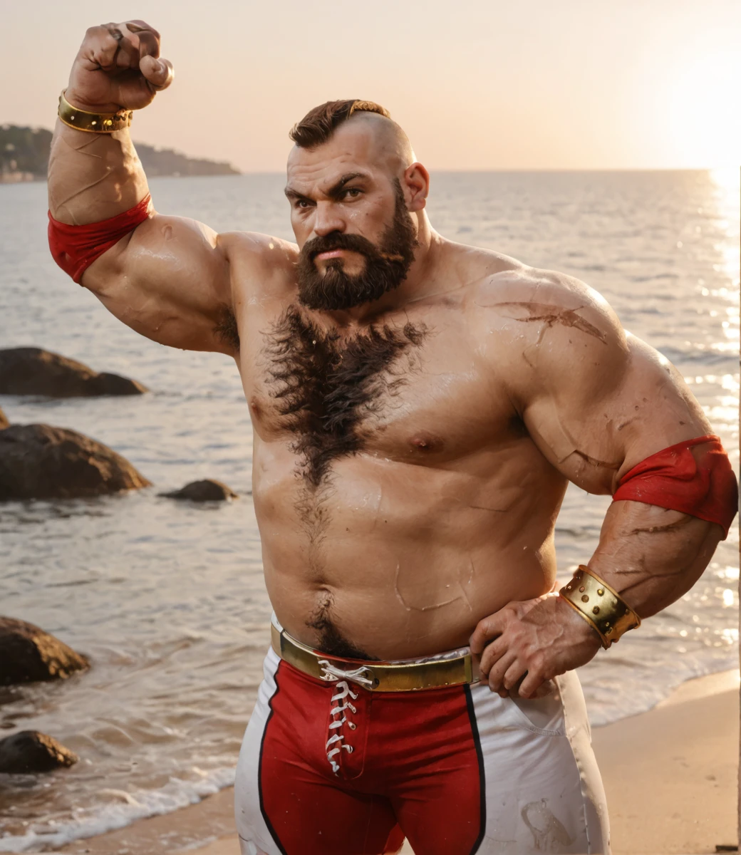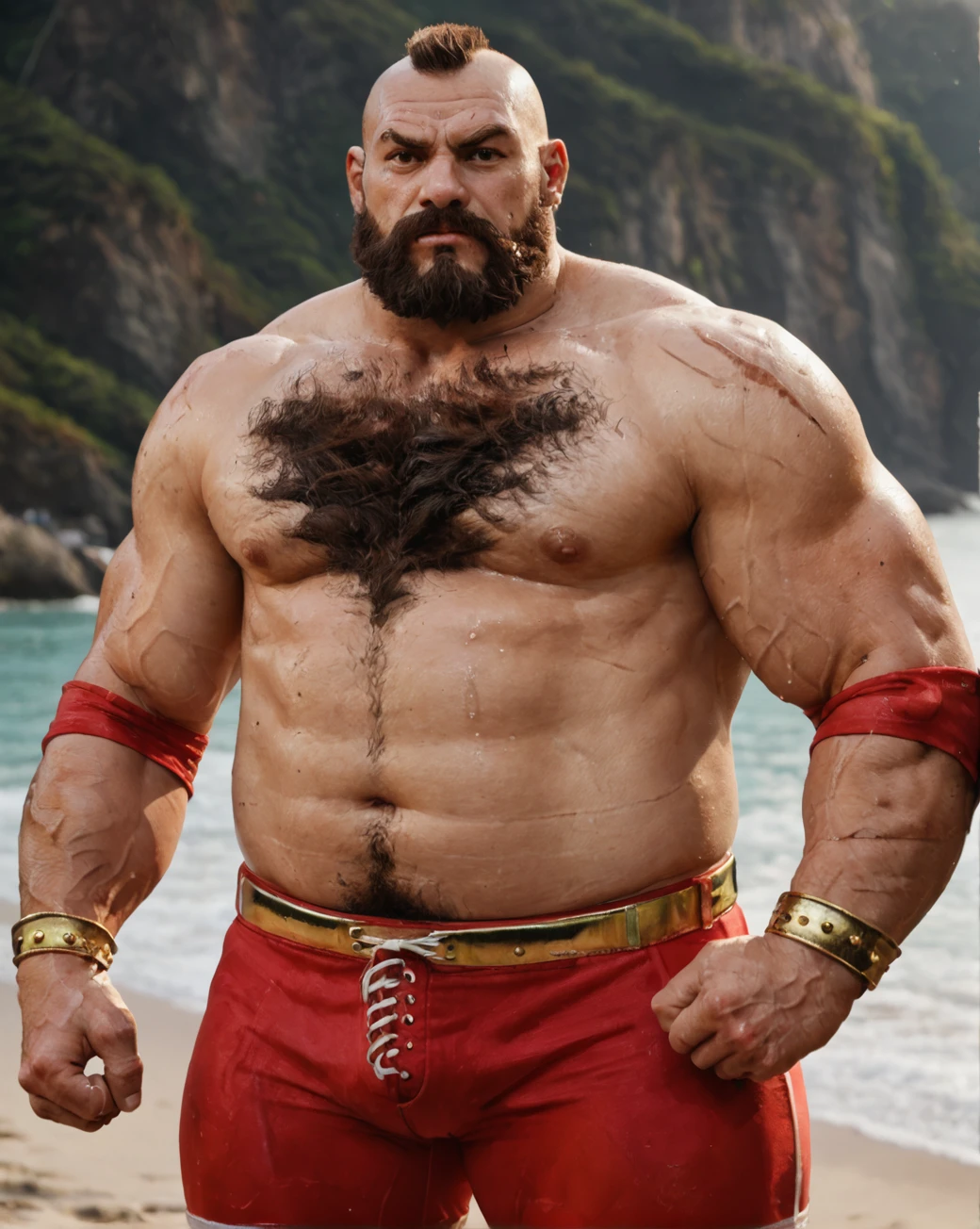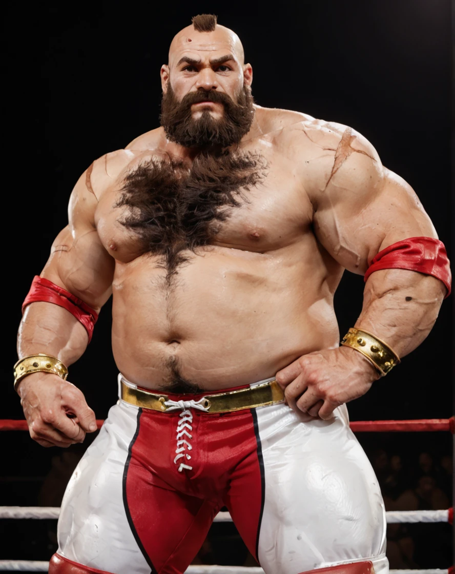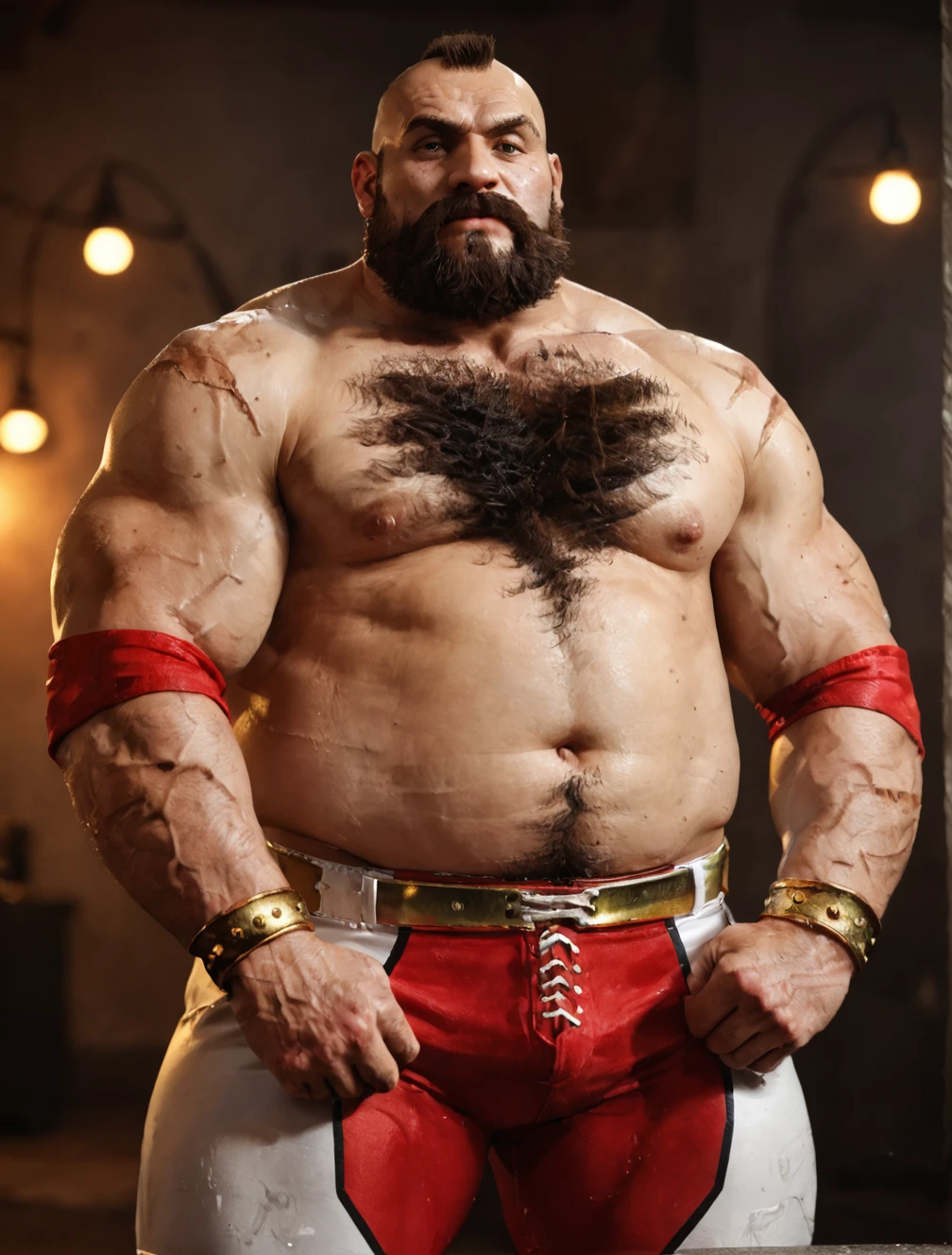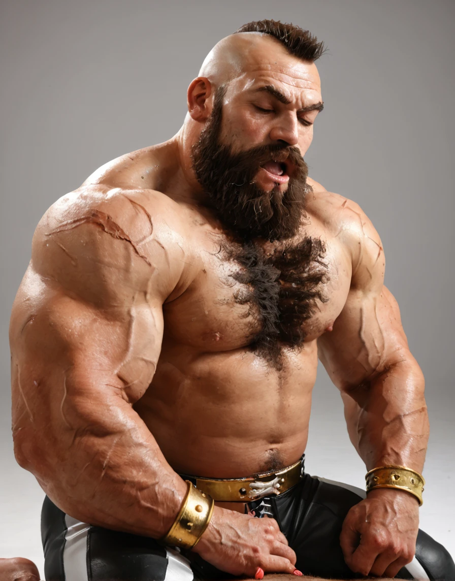 (sf6-zangief:1.1), mohawk, scar, full beard, body hair, leg hair, wrestling pants, elbow pads, gold bracelet,frown, sweat,