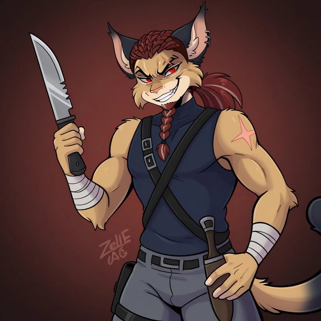 zeldane_uq, 1boy, solo, furry, furry male, animal ears, male focus, braid, brown hair, red eyes, scar, red hair, earrings, tail, long hair,