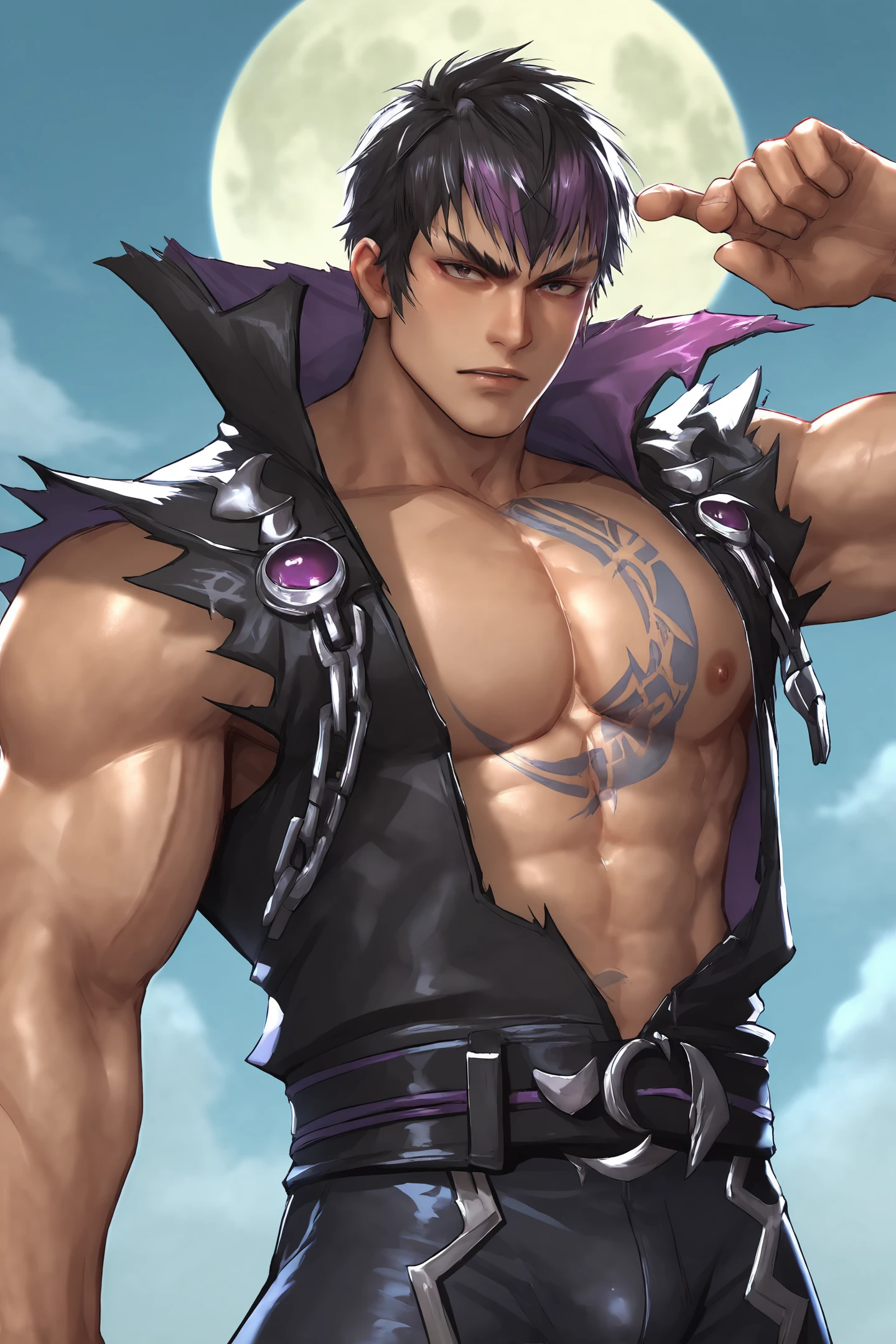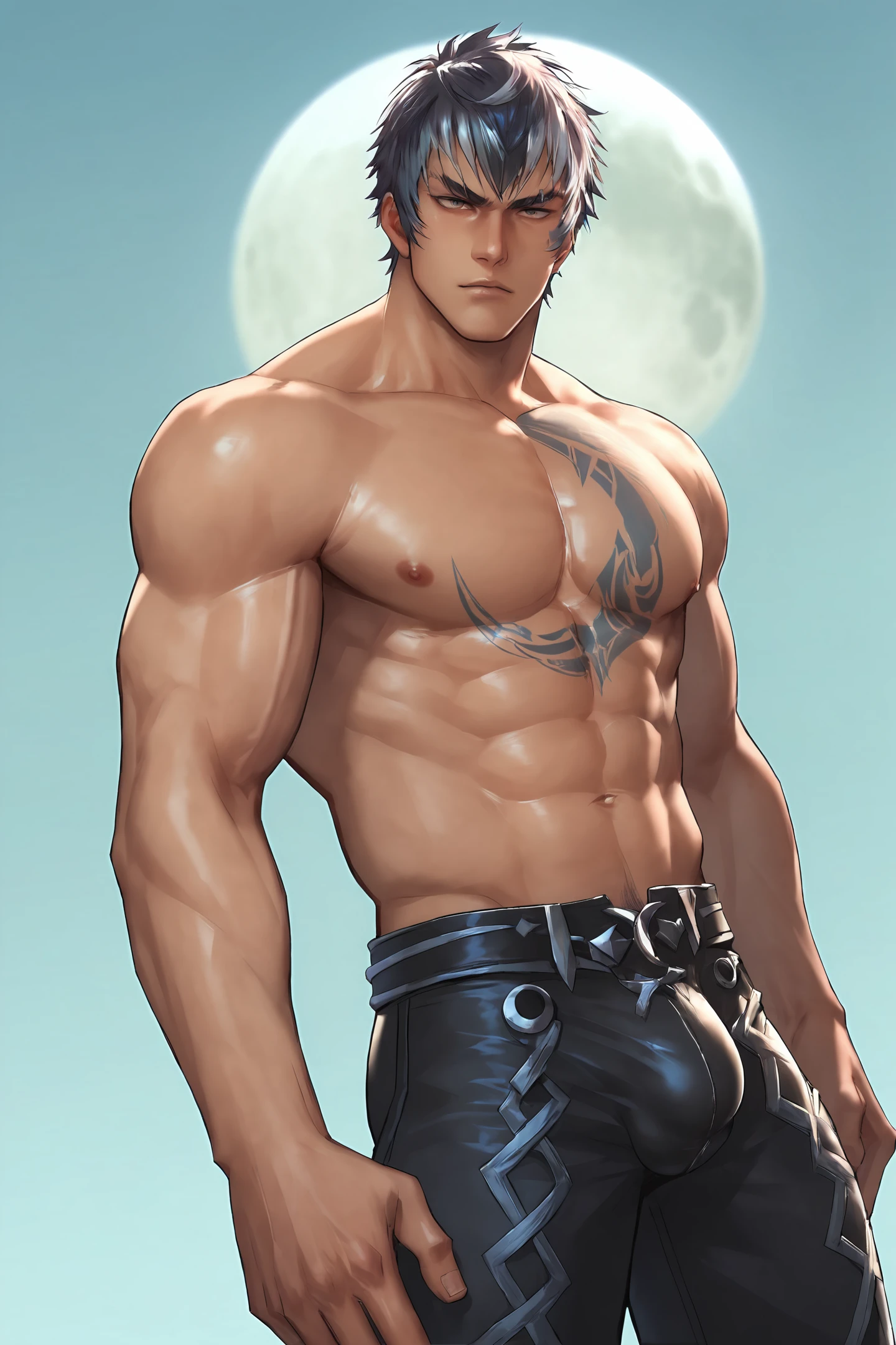 zwei, two toned hair, muscular, moon tattoo on chest,