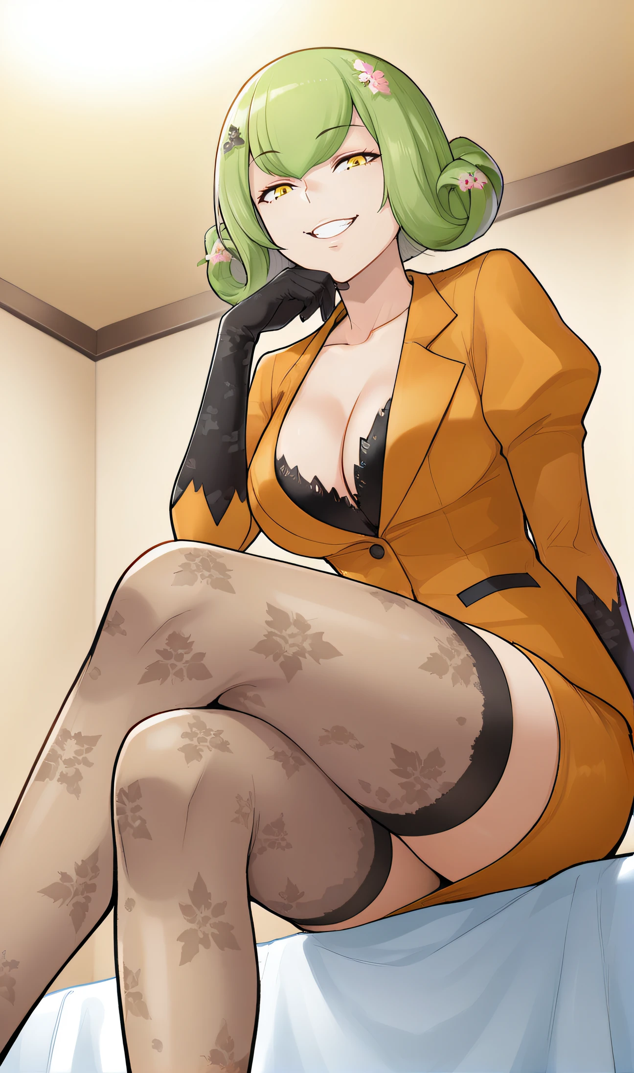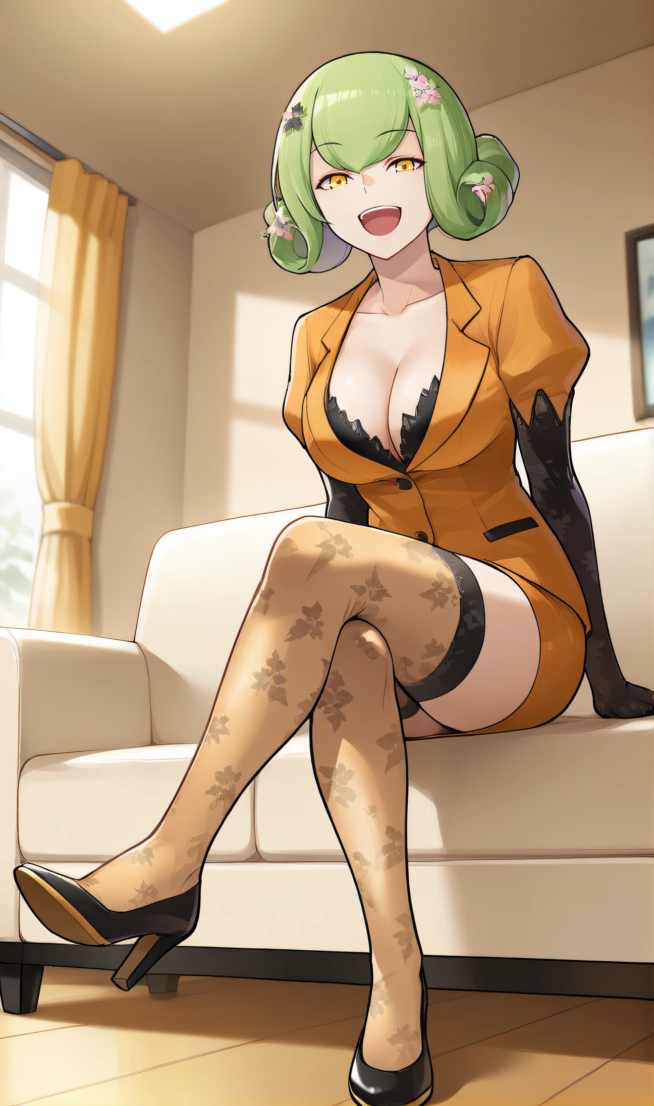 kishiberie, green hair, yellow eyes, hair flowers, cleavage, collarbone, elbow gloves, orange jacket, orange pencil skirt, print thighhighs