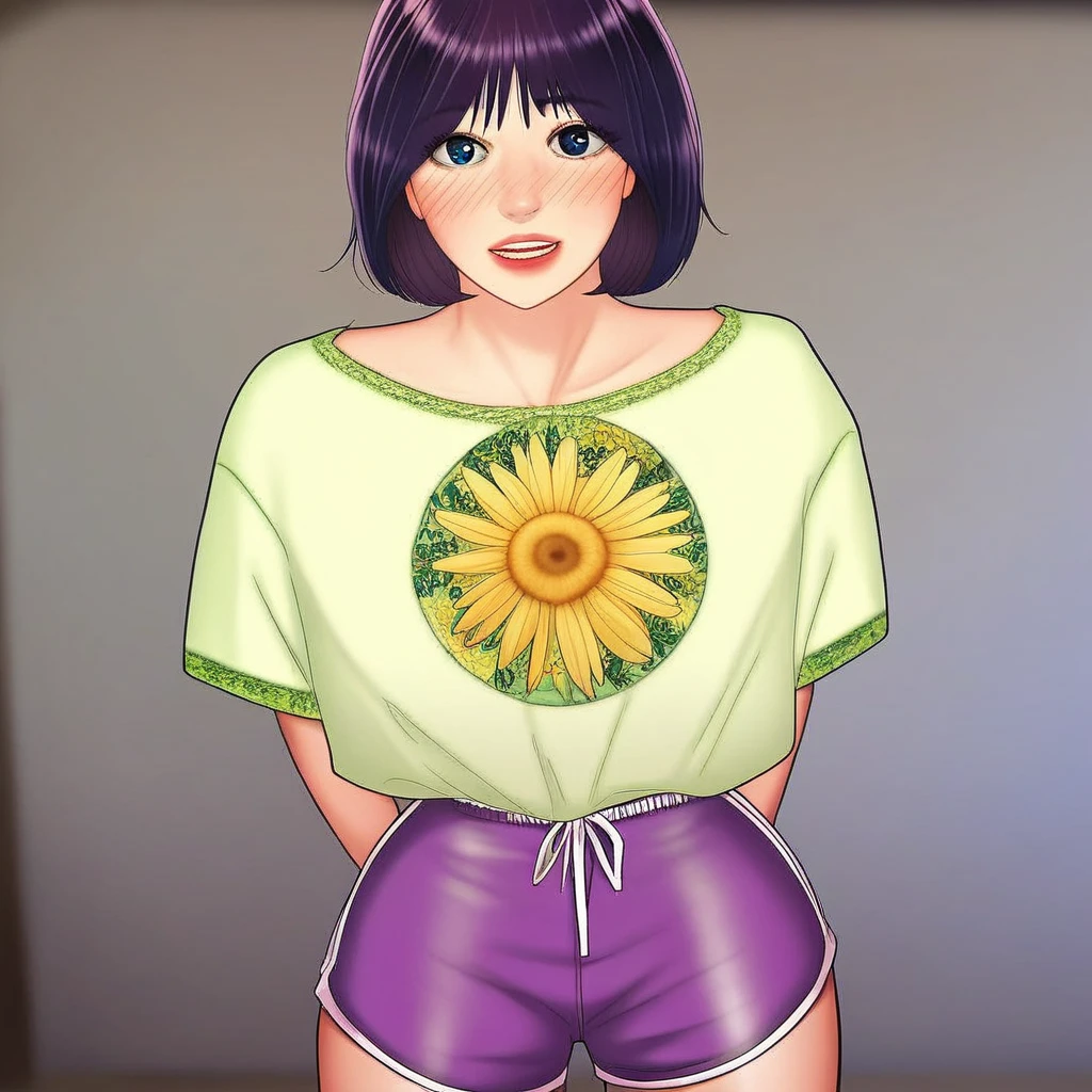 2. ((short-sleeves green top with floral disign, pink shorts, ))