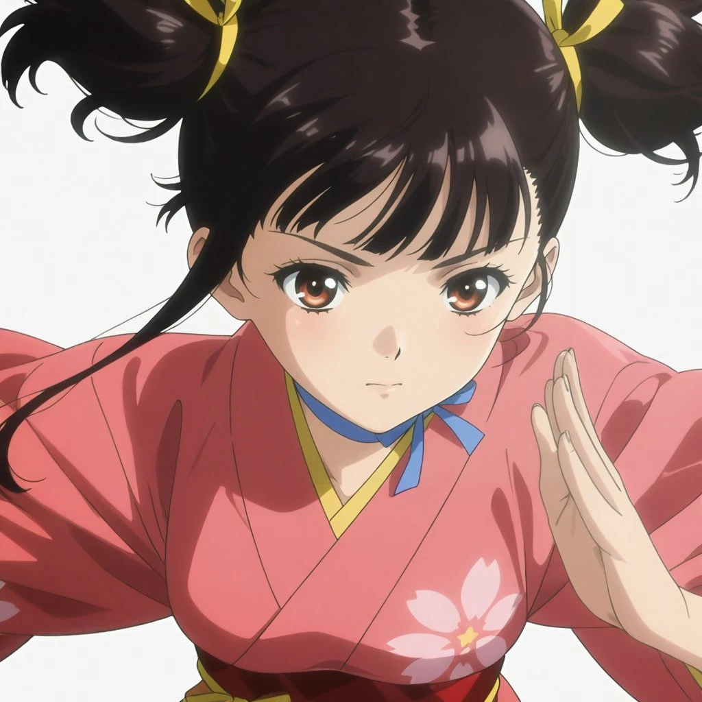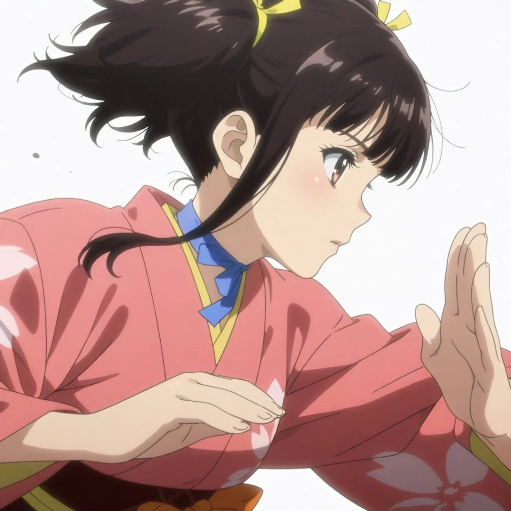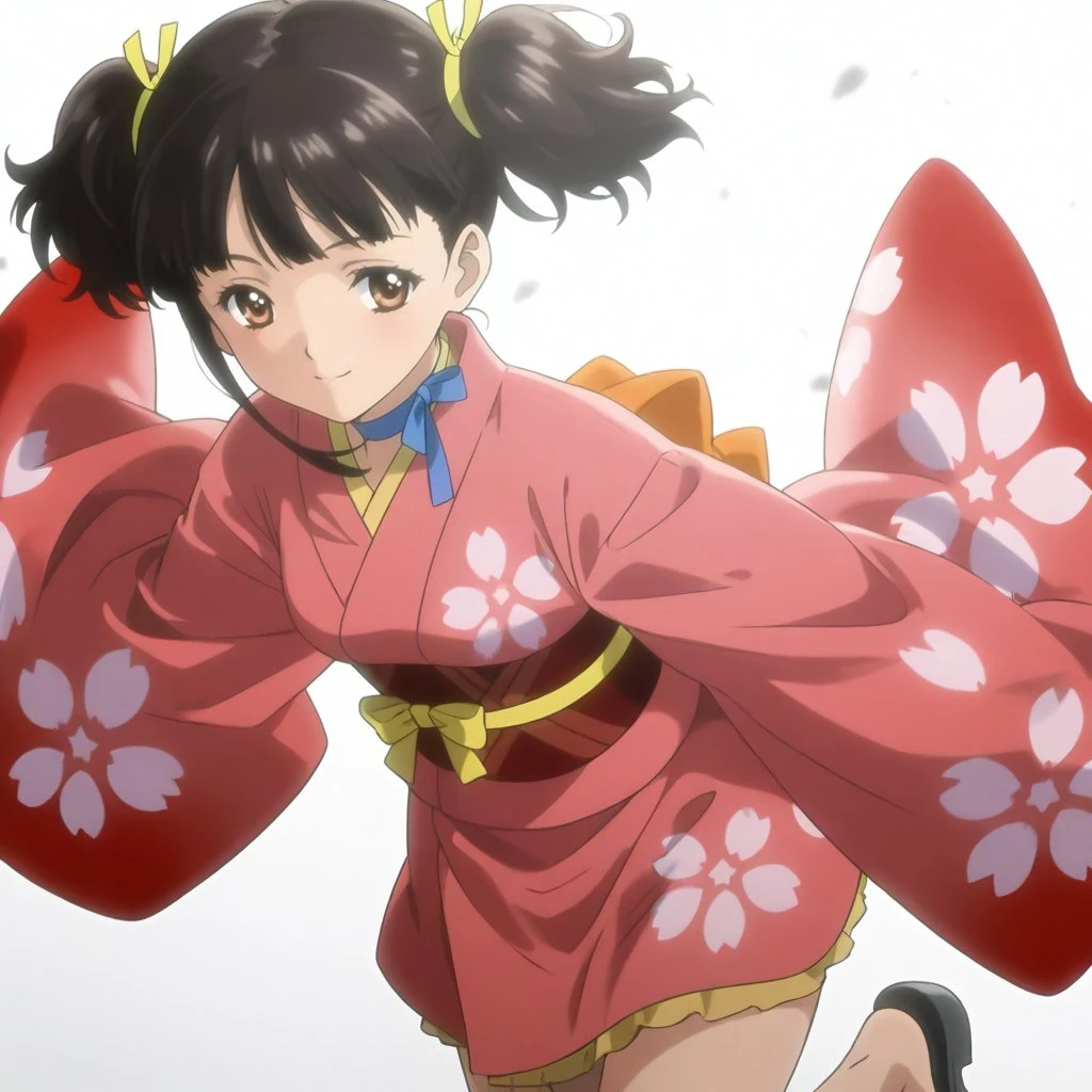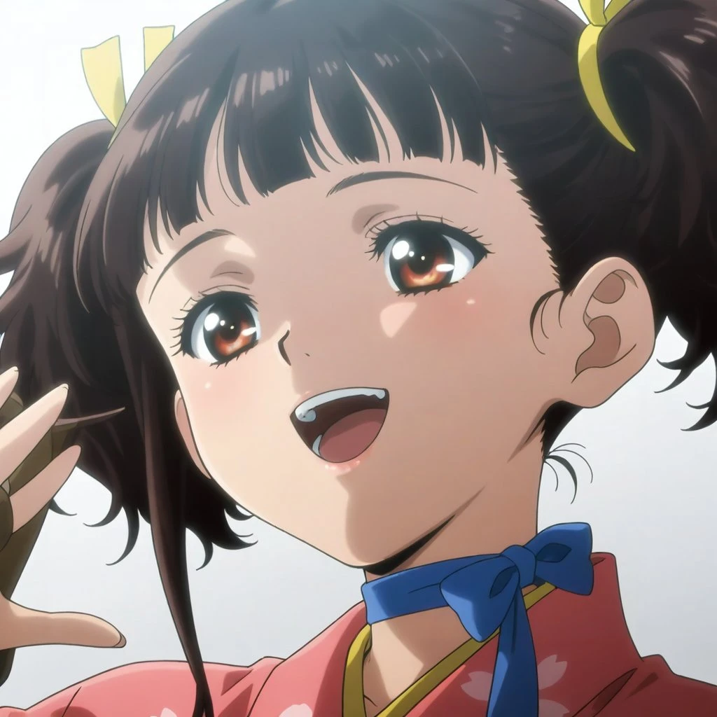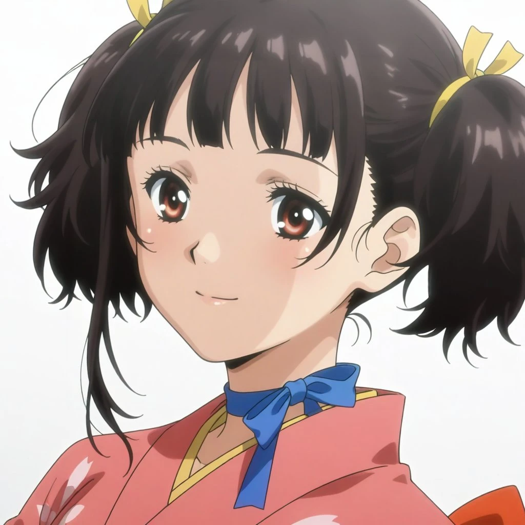 Appearance: sdxl-kabaneri-mumei, black hair, twintails, ribbon choker, brown eyes, short hair, hair ribbon, short twintails, blunt bangs, blue choker, yellow ribbon, sidelocks, blue neck ribbon, eyelashes