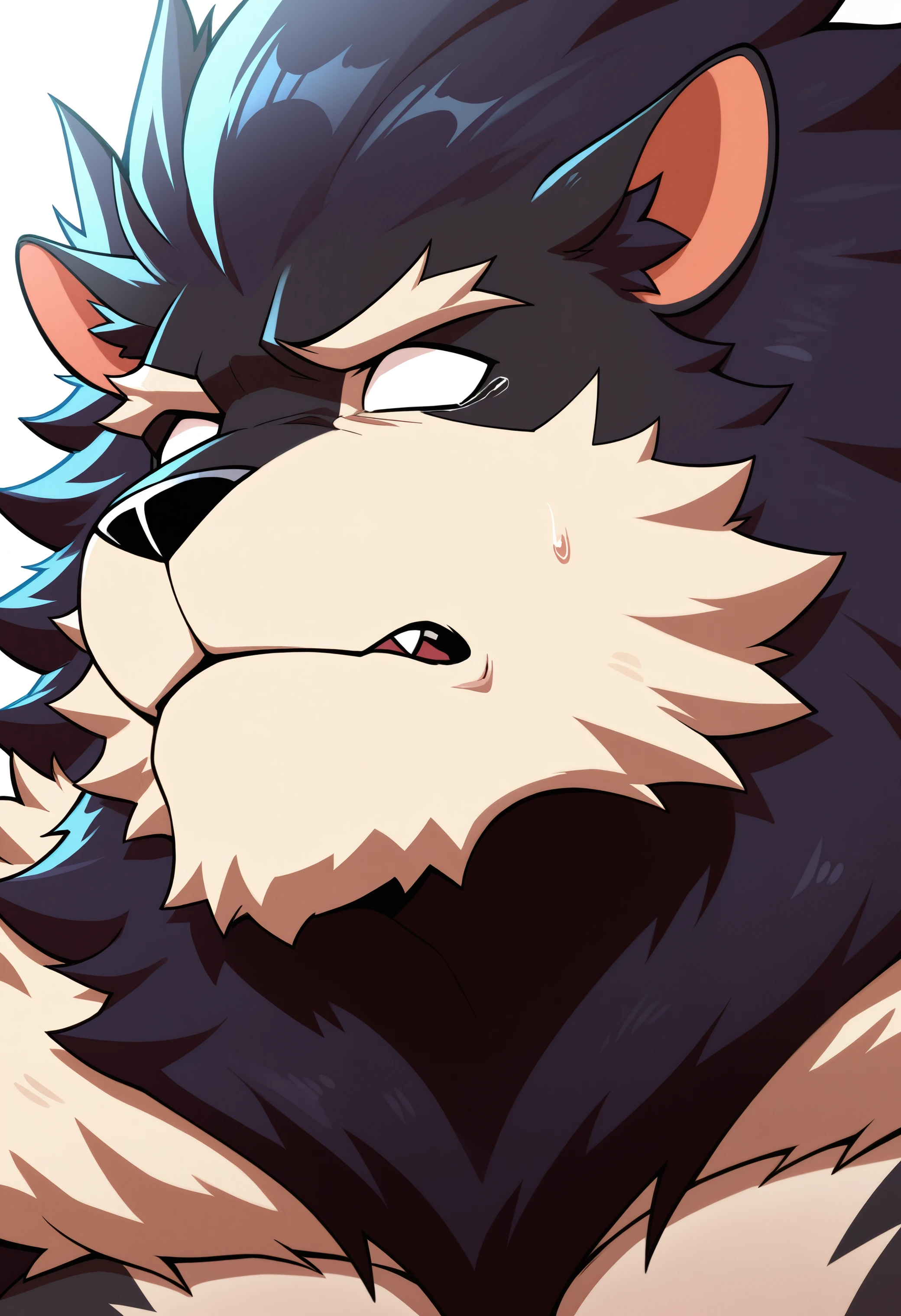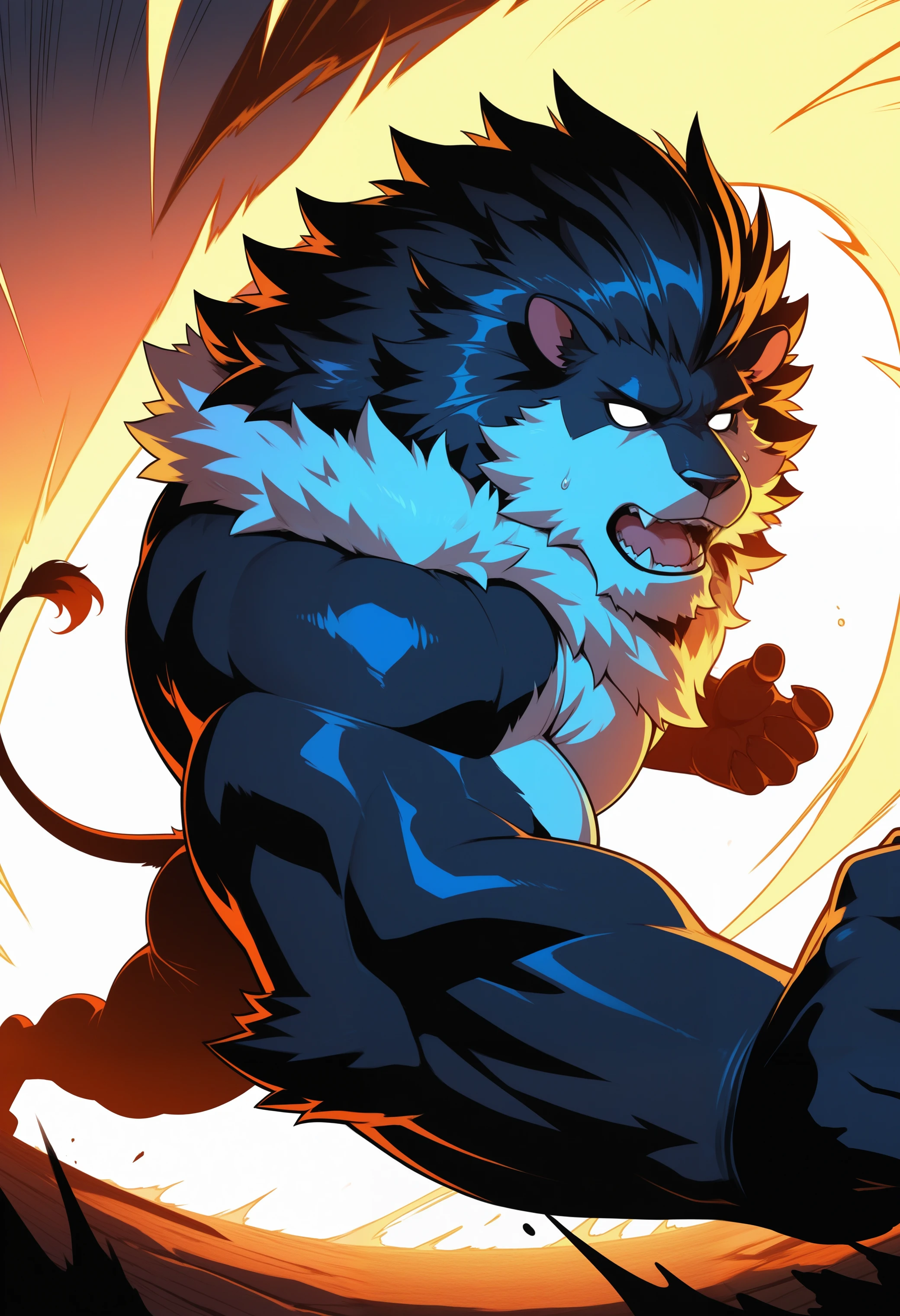 bl4ck, lion boy, bara, black fur, white_chest, no pupils, black pants,
