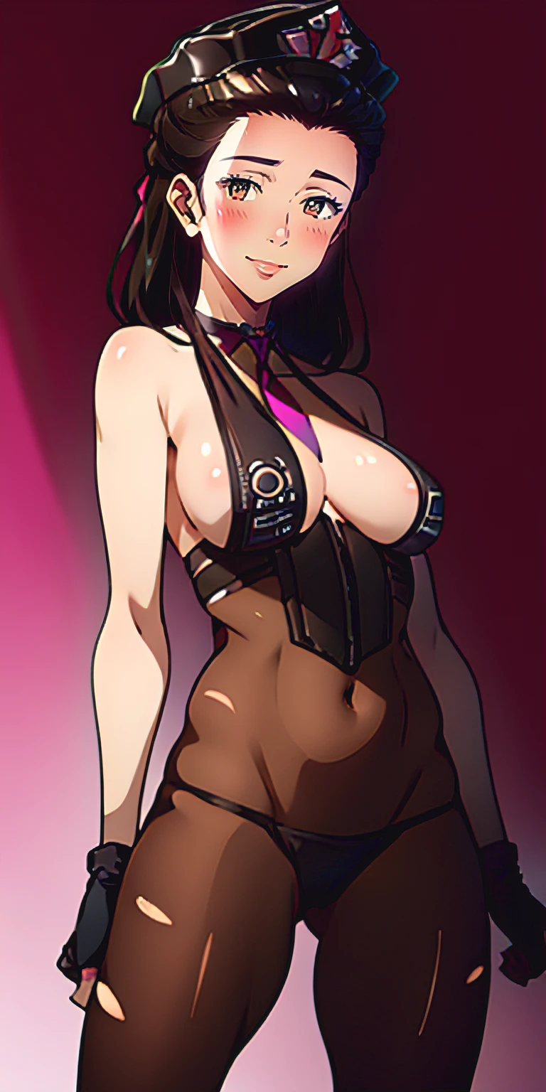 outfit-sess, torn bodystocking, police hat, pink Necktie, armband, fingerless gloves