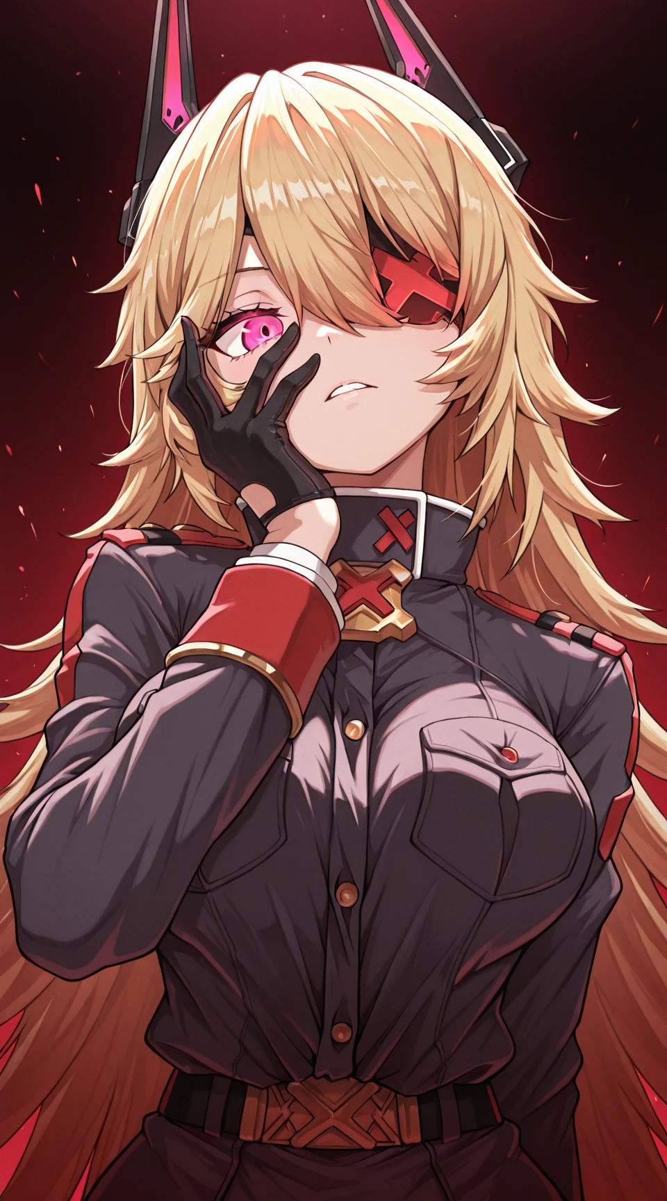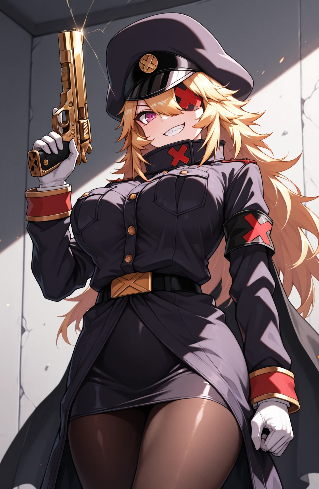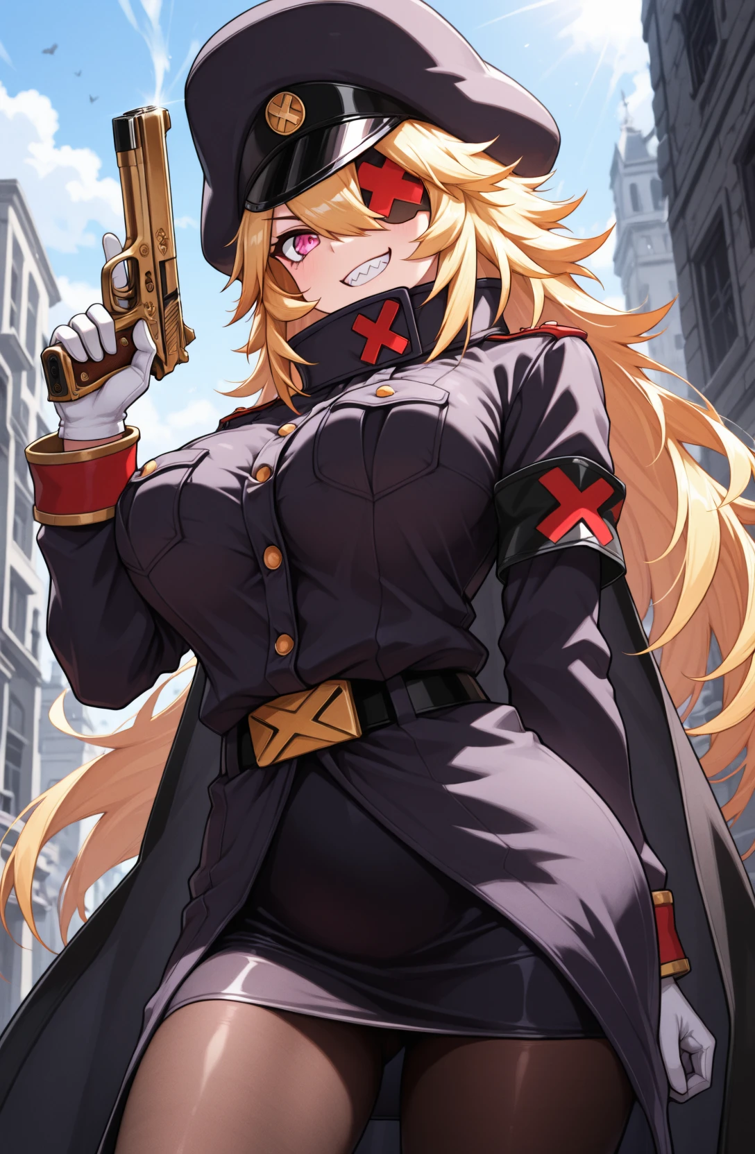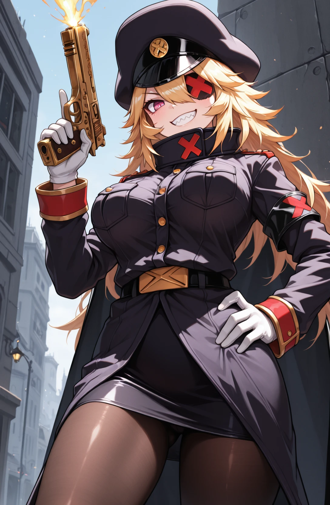 Prompt for classic look: pwembg, eyepatch, peaked_cap, grin, military_uniform, coat, belt, white_gloves, black cape, skirt, pantyhose, rx_armband