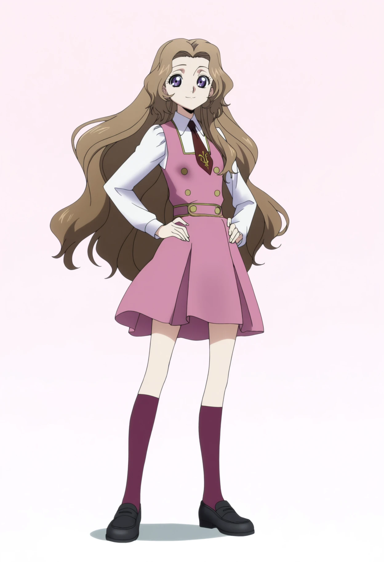 School Uniform prompts : school uniform, ashford academy school uniform, kneehighs, necktie, pinafore dress, long sleeves, shirt, white shirt, pink dress, shoes
