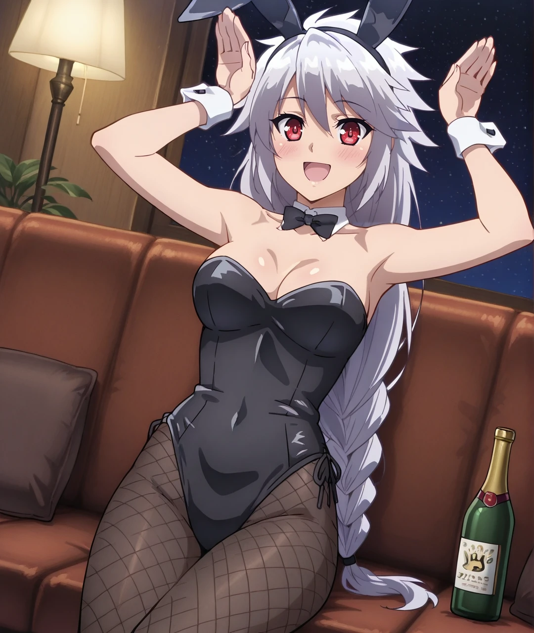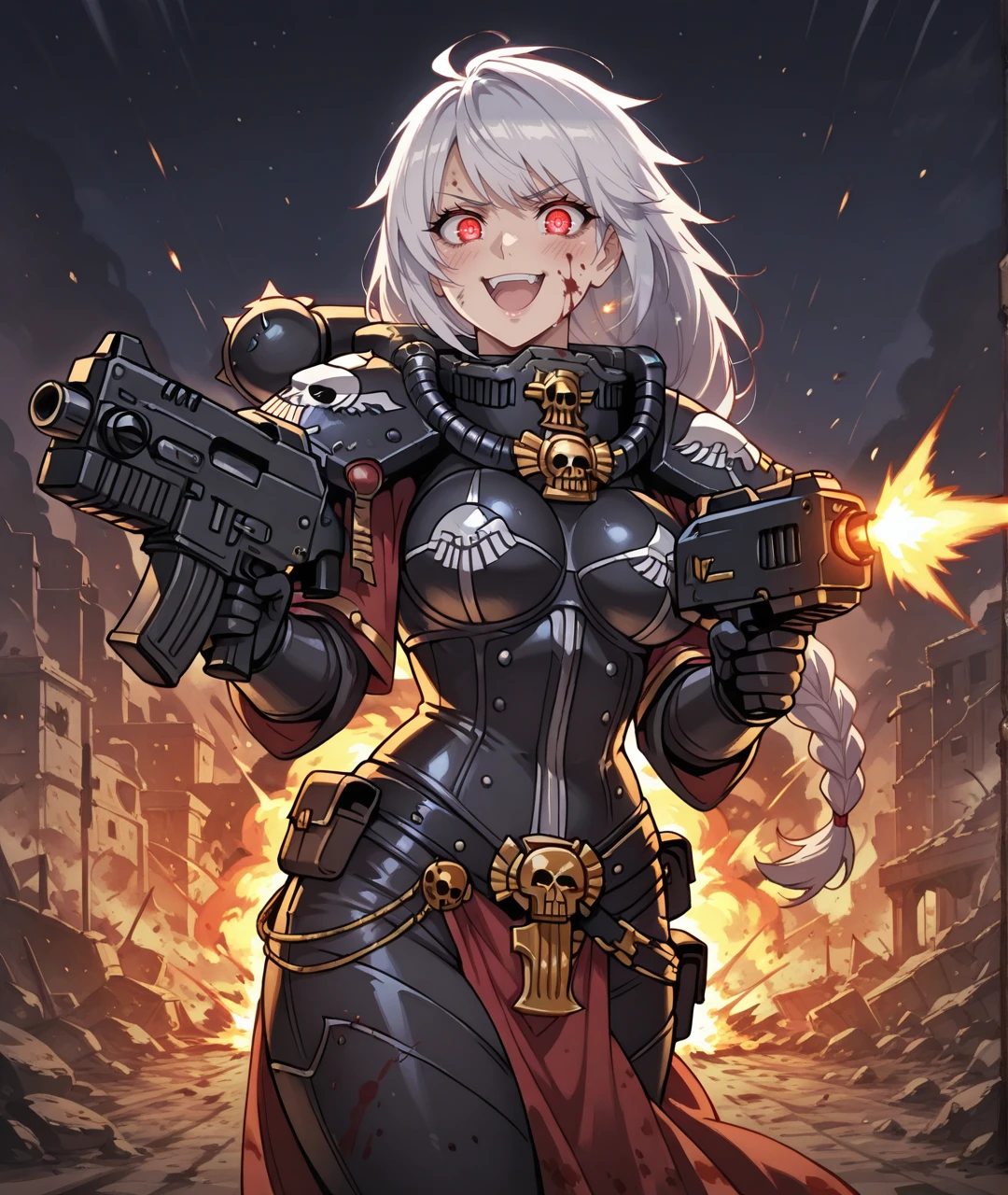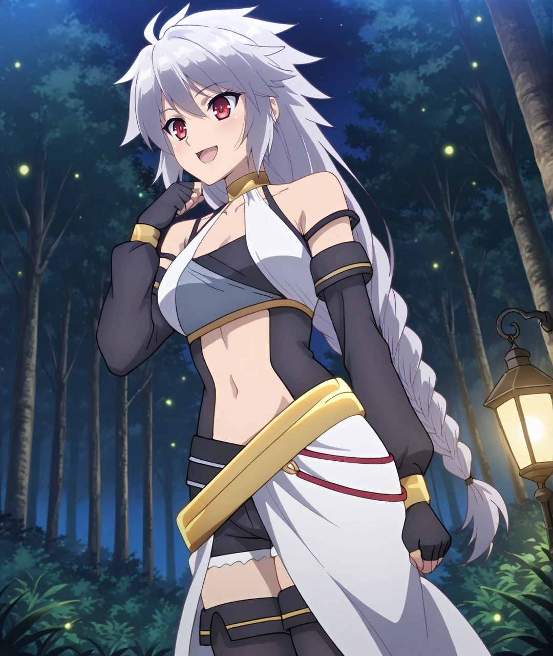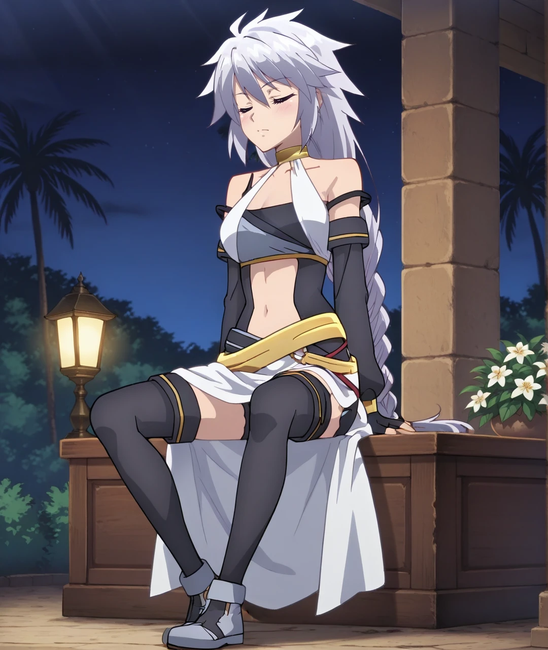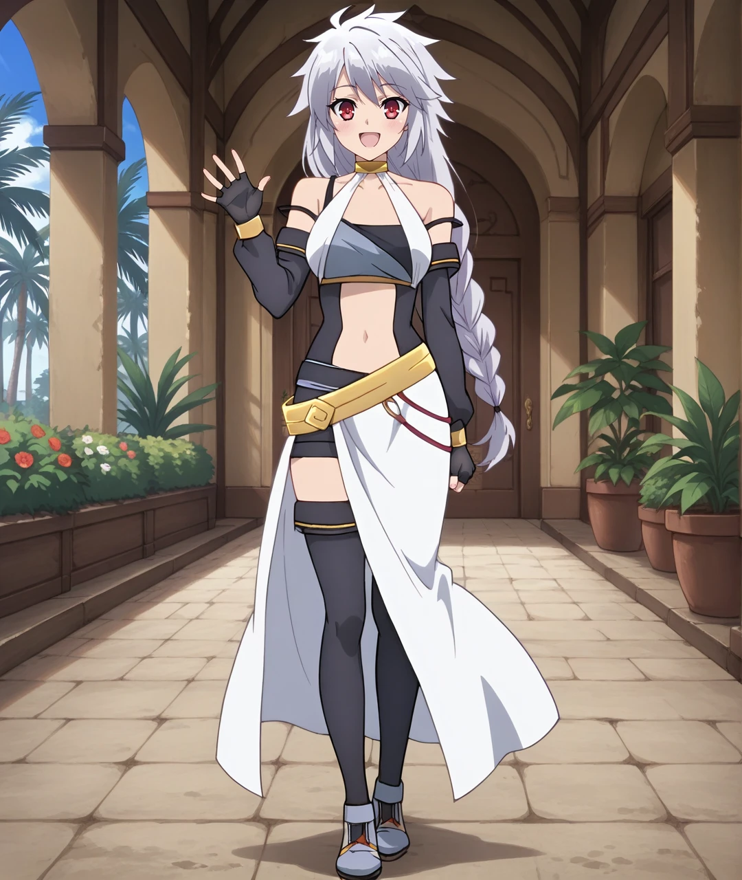 Tags: SigrunBase, red eyes, silver hair, long hair, braid, single braid, bare shoulders, asymmetrical outfit, halter neck, gold choker, medium breasts, collarbone, sleeveless top, clothing cutout, navel, detached sleeves, black elbow gloves, black fingerless gloves, gold belt, black shorts, white skirt, high slit, side slit skirt, black thighhighs, gray shoes,