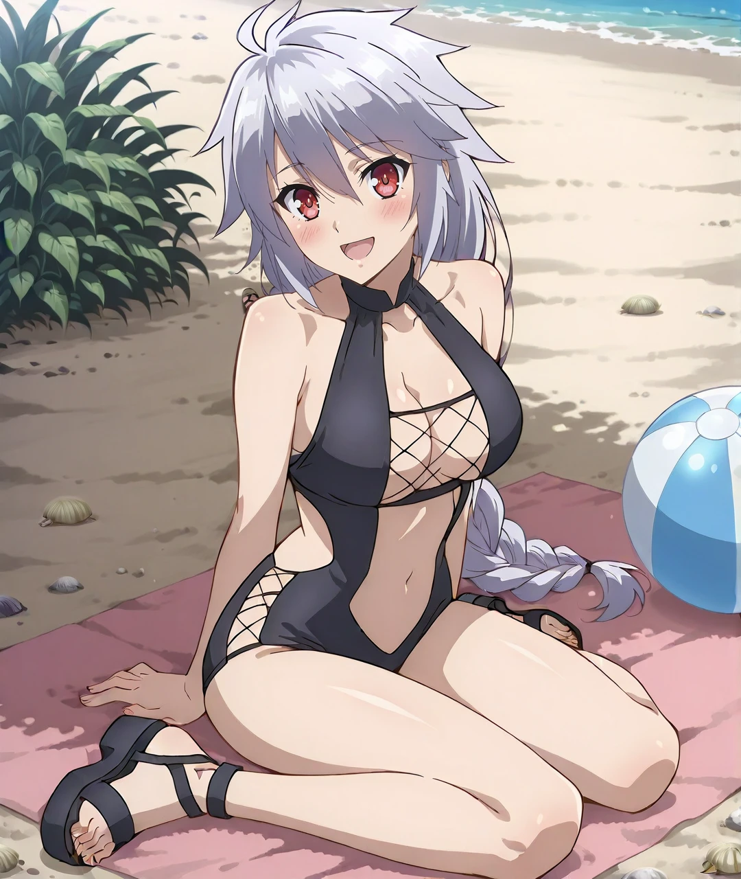 SigrunBase, red eyes, silver hair, long hair, braid, single braid, bare shoulders, asymmetrical outfit, halter neck, gold choker, medium breasts, collarbone, sleeveless top, clothing cutout, navel, detached sleeves, black elbow gloves, black fingerless gloves, gold belt, black shorts, white skirt, high slit, side slit skirt, black thighhighs, gray shoes,