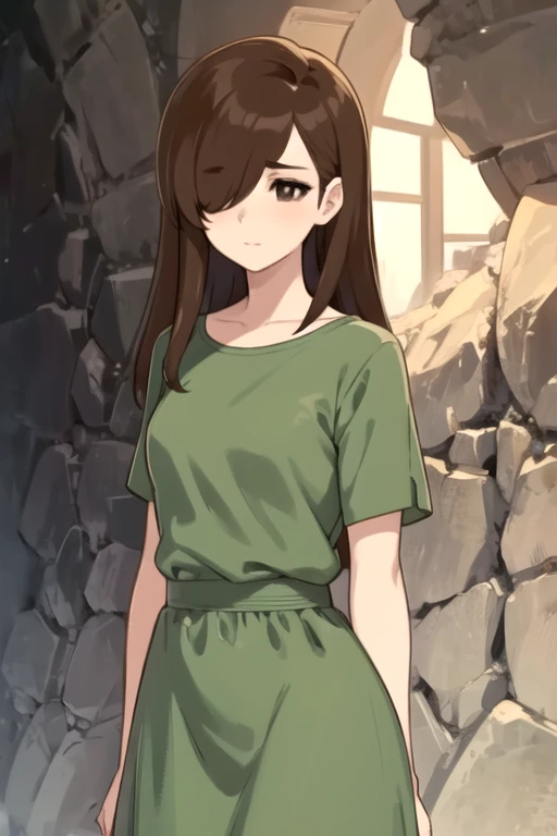 NonGenma, 1girl, solo, long hair, brown hair, green dress, brown eyes, short sleeves, hair covered eye