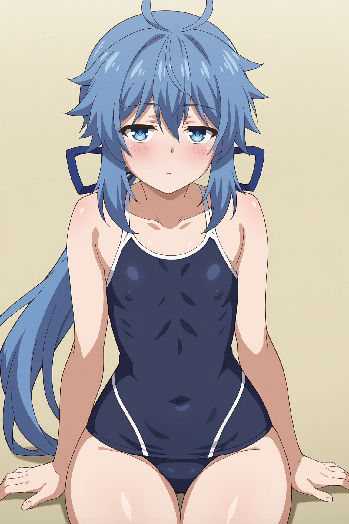 1girl, ryiel rayford, rokudenashi majutsu koushi to akashic record, blue eyes, blue hair, long hair, low ponytail, hair ribbon, antenna hair, flat chest,