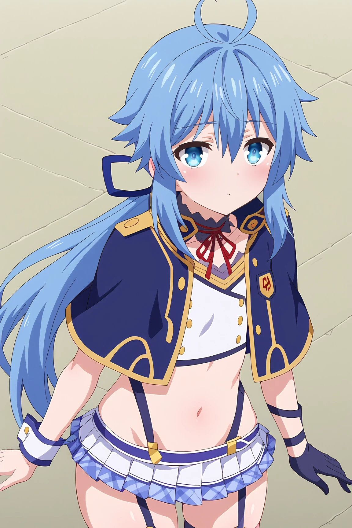 1girl, ryiel rayford, rokudenashi majutsu koushi to akashic record, blue eyes, blue hair, long hair, low ponytail, hair ribbon, antenna hair, flat chest,outfit 1 (Alzano School Uniform):