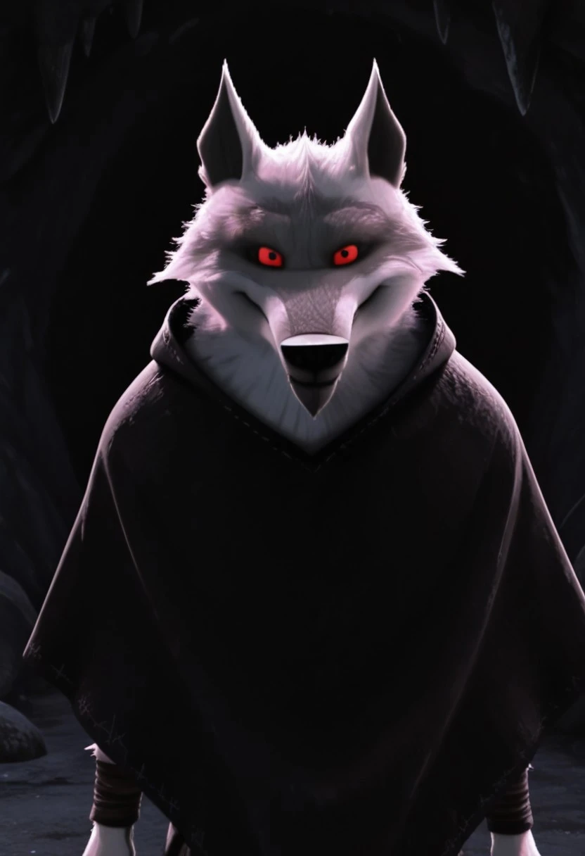 deathwolf, wolf, anthro, gray fur, red eyes, 3D, cgi, furry, male, black cloak, black nose, wolf ears,