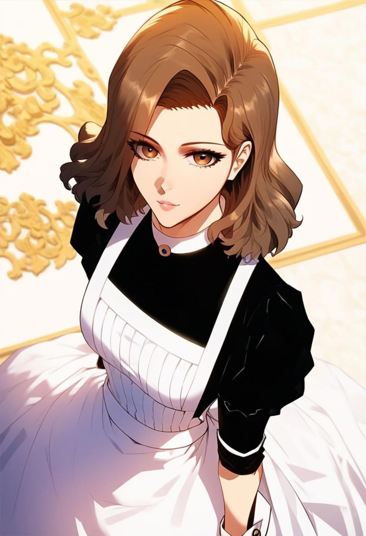 GillyMcrolan, brown eyes, brown hair, medium hair, maid uniform