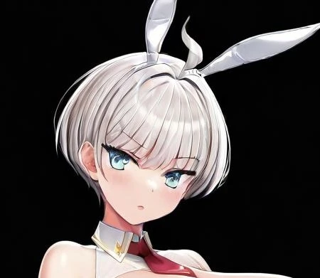 ,Minya Plenabus 8102, , silver short hair, blue eyes, bob cut, ahoge, white fake animal ears, fake rabbit ears, playboy , pantyhose, wrist cuffs, white leotard, cleavage, necktie, collared, white heels,