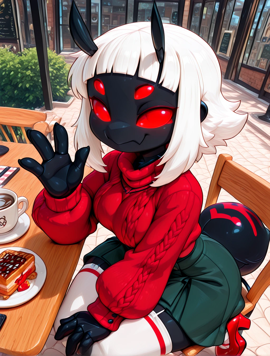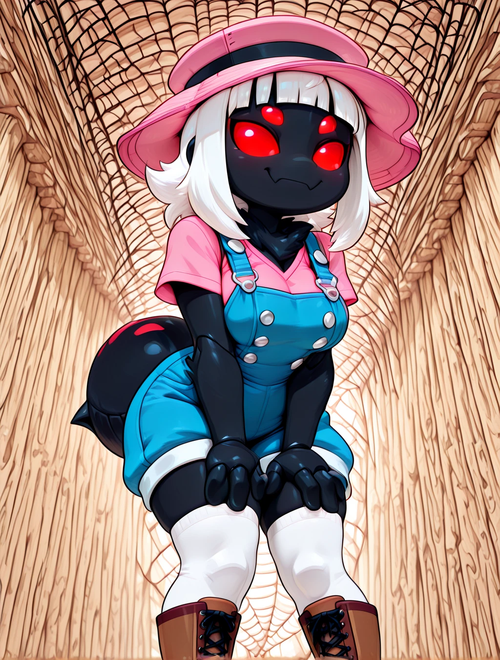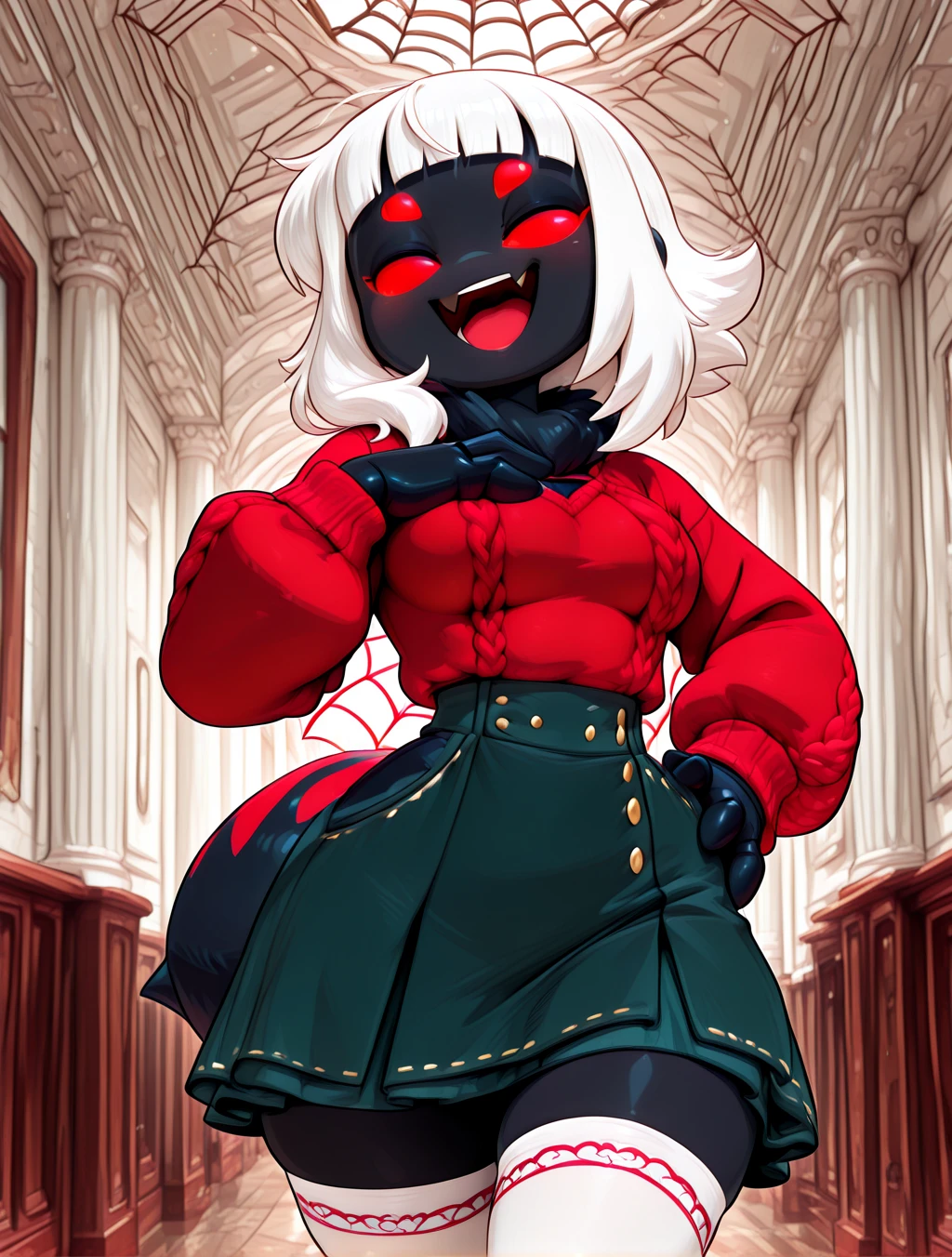 (arthropod female, spider, black body, abdomen, spider tail, black neck tuft, red solid eyes, four eyes, white medium hair, shag cut, sidelocks, short bangs)