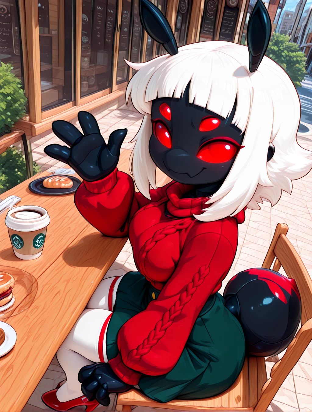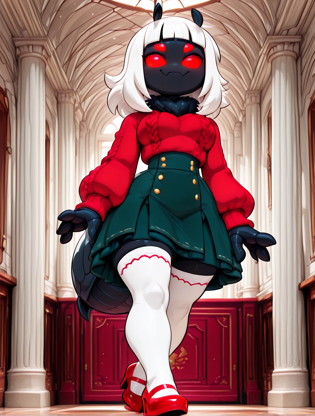 (red cropped cotton knit sweater, puffy long-sleeves, dark-green knit skirt with a royal bow, white line stockings with red top-trim, red high-heels)