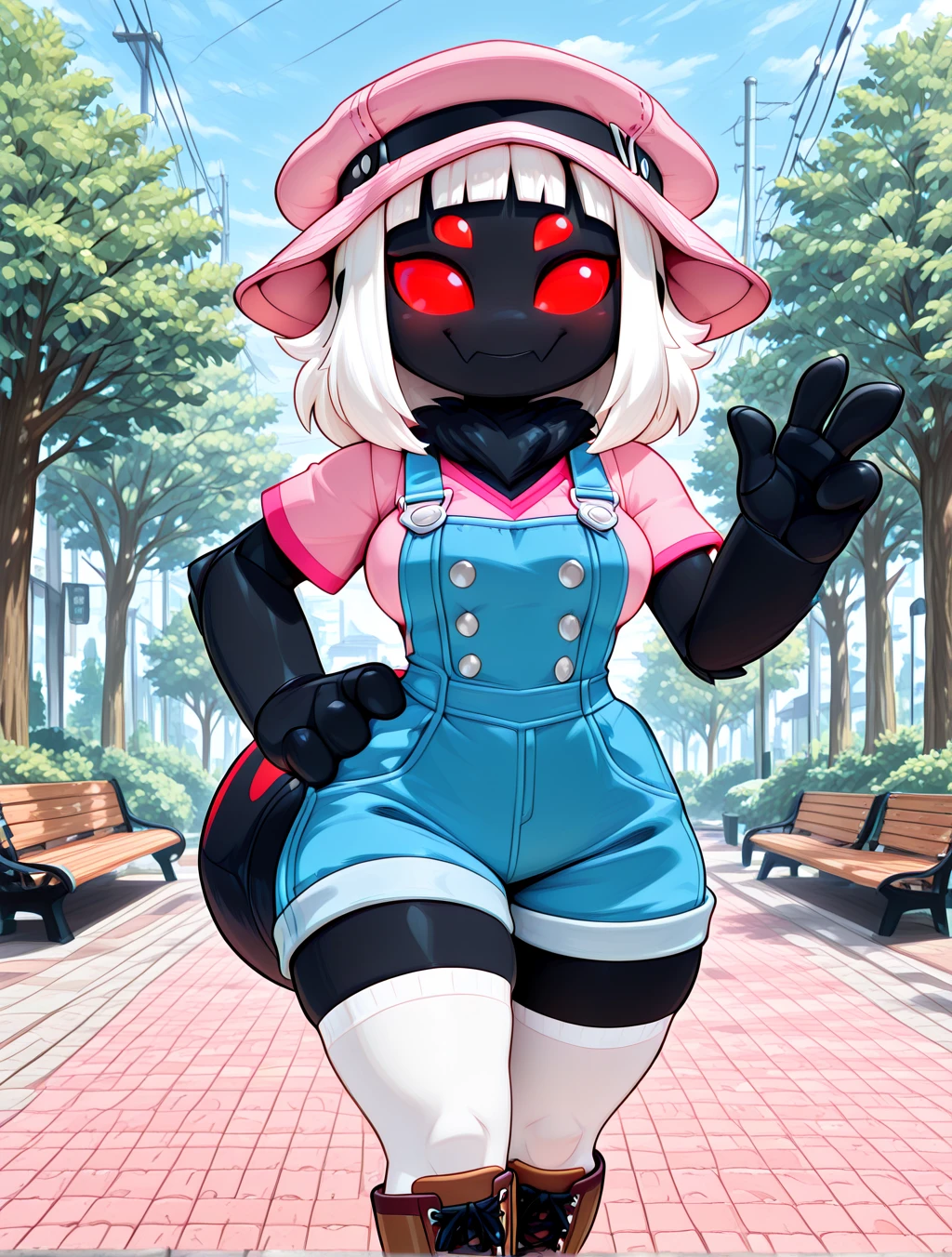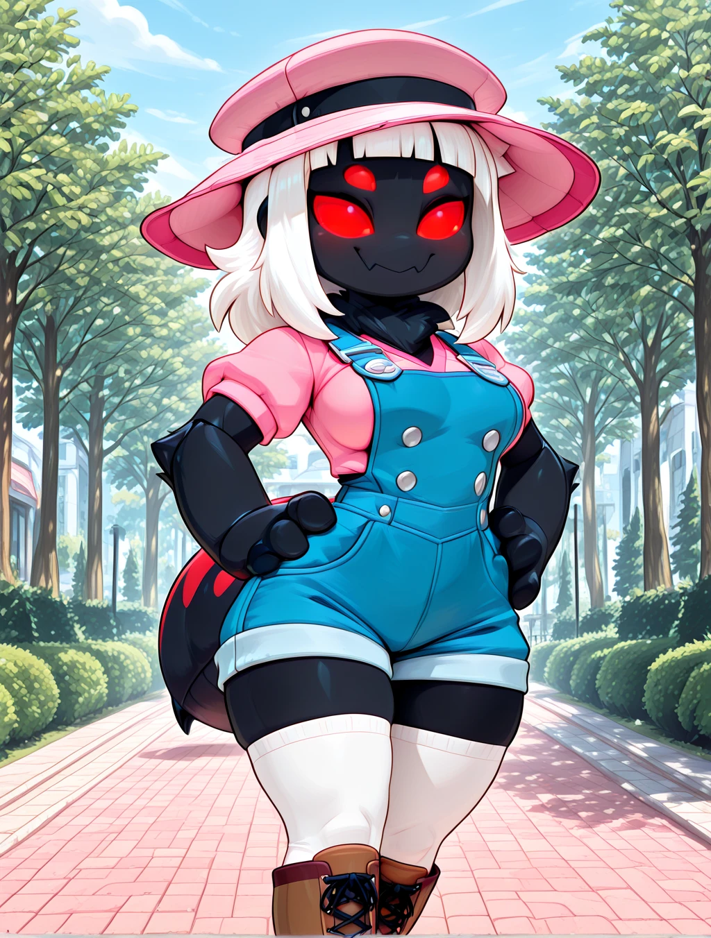 (pink cloche hat with black band, pink linen v-neck shirt, short sleeves, blue overalls with silver buttons, white thigh-highs, brown knee-high boots with laces)
