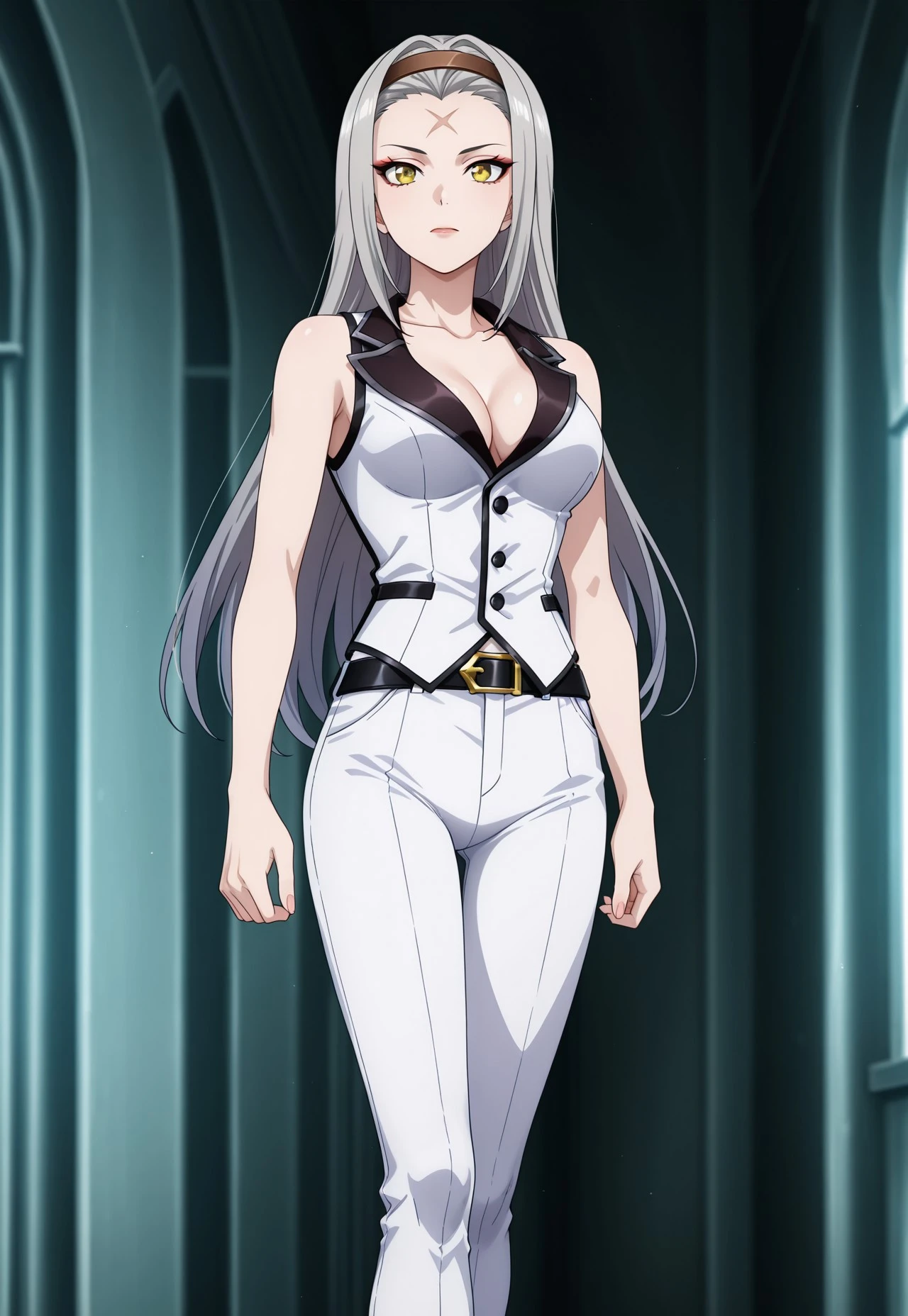 Kuki Ageha, anime screencap, anime, 1girl, solo, tall, long legs, medium breasts, gray hair, very long hair, straight hair, brown hairband, sidelocks, yellow eyes, cross-shaped forehead scar, sleeveless vest, black trim vest, no undershirt:1.0, white vest, 4 buttons:1.0, black buttons, white pants, black belt, gold belt buckle, cleavage