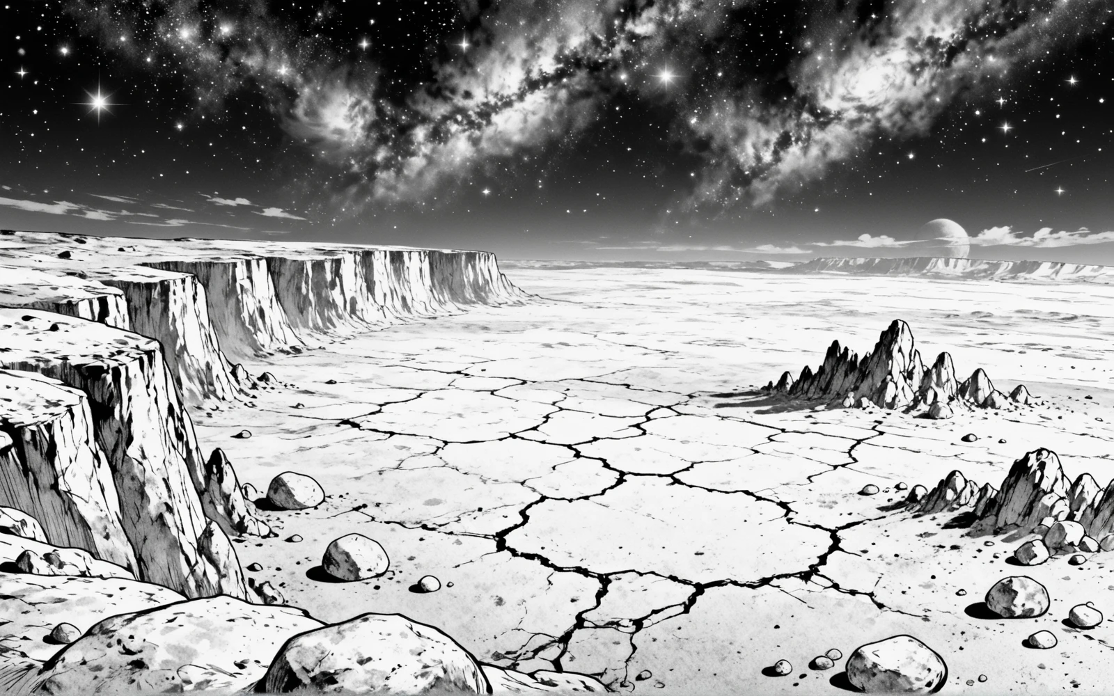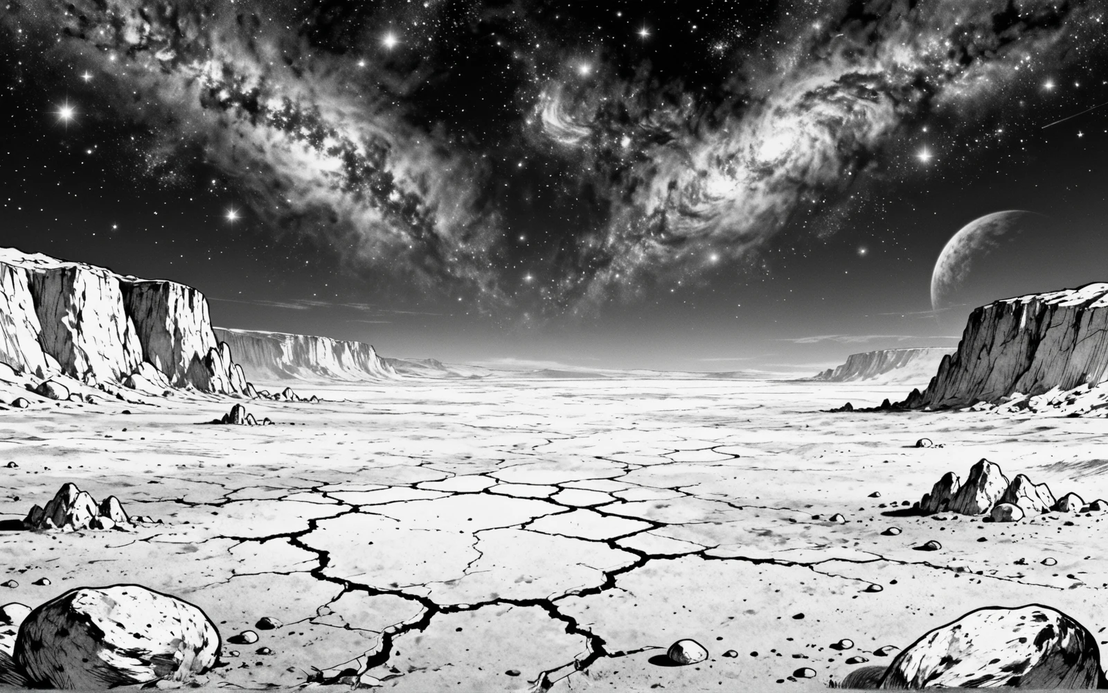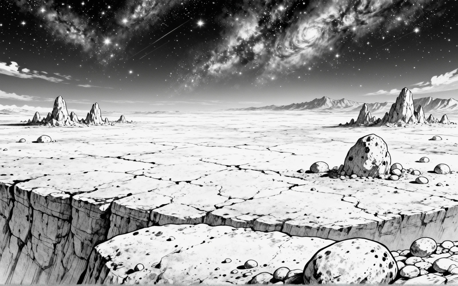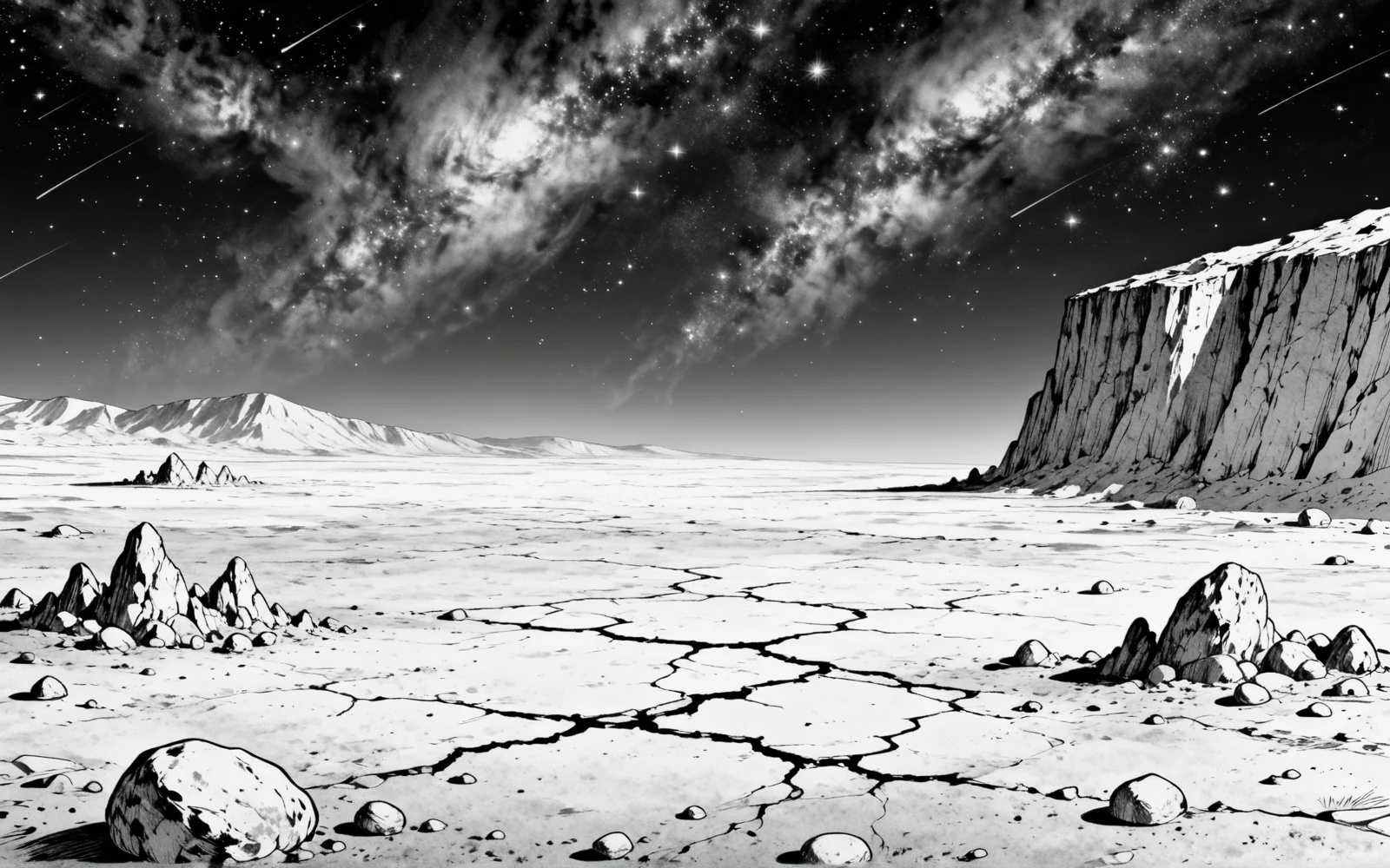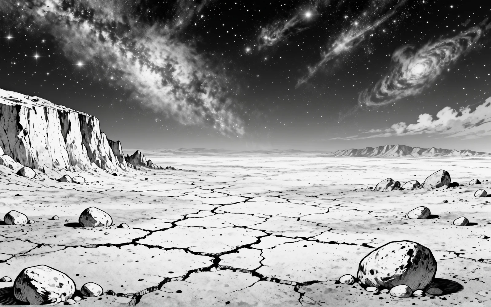 This specific LoRA focuses on rocky, barren desert landscapes under dramatic outer space skies. It is ideal for depicting desolate alien worlds, wastelands, battle locations, long establishing shots, and quiet atmospheric moments between fights. The style is optimized for anime and manga visuals, with strong linework, high contrast, and panel-ready depth.