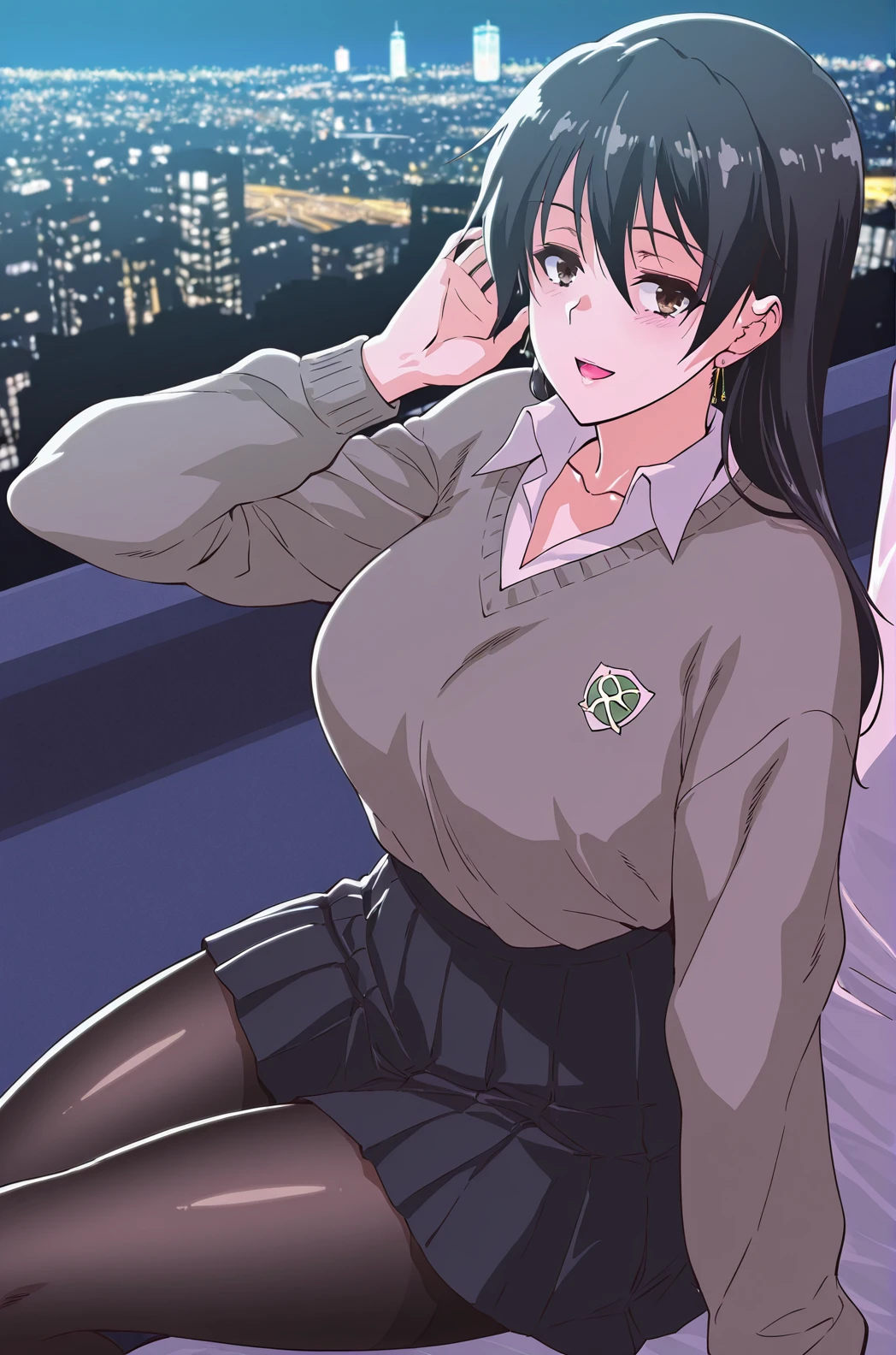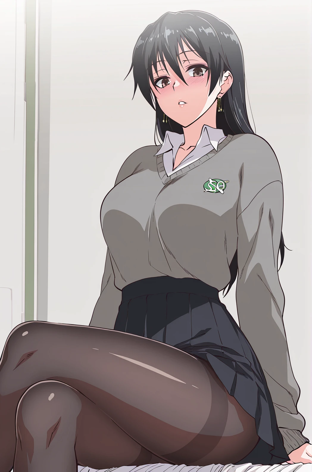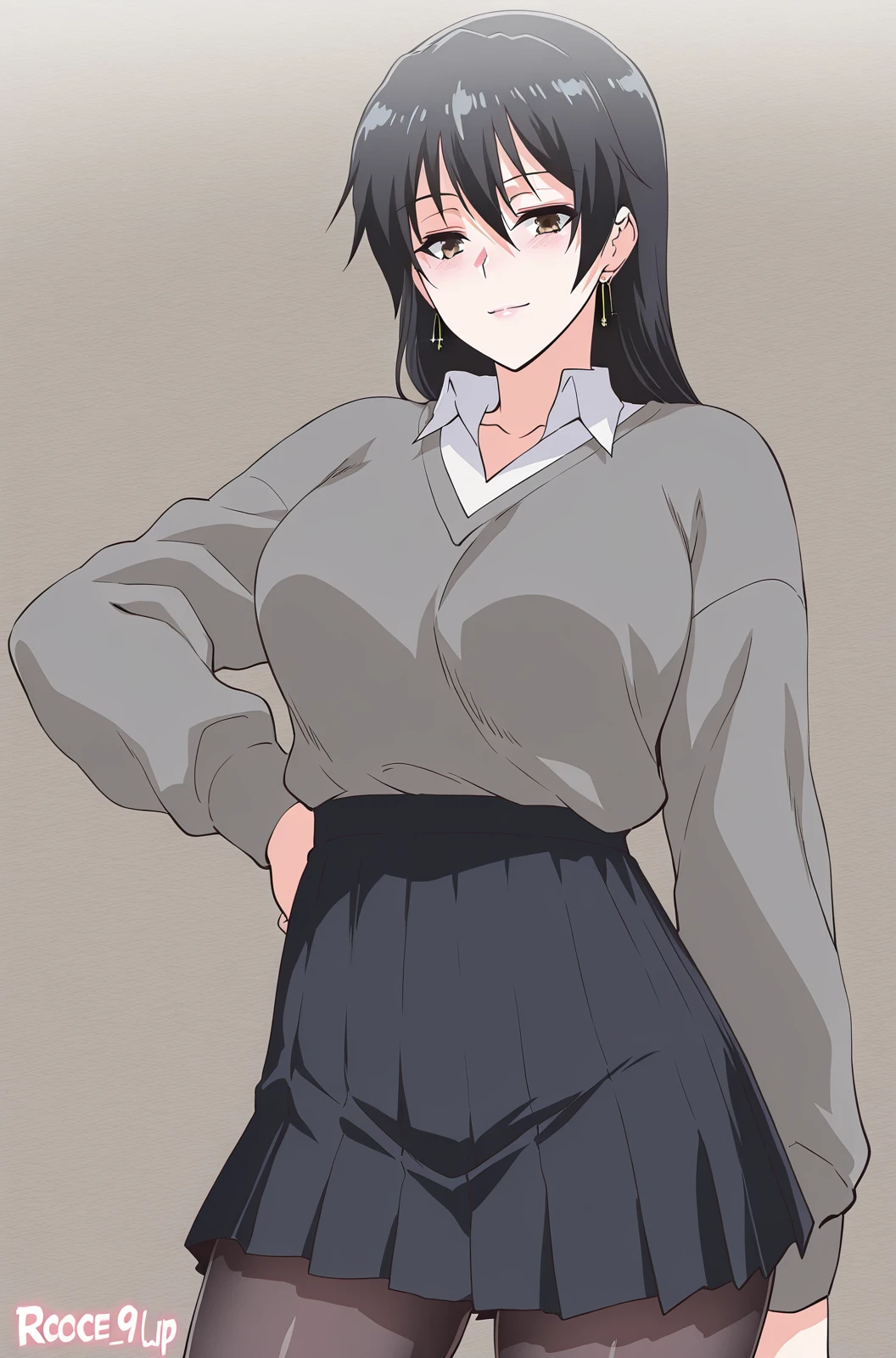 Seohyun, 1girl, solo, brown eyes, black hair, long hair, irregular bangs, hair between eyes, sidelocks, loose hair, earrings,