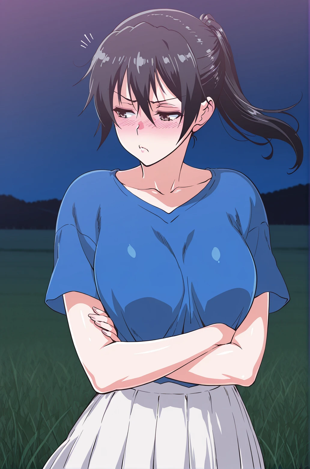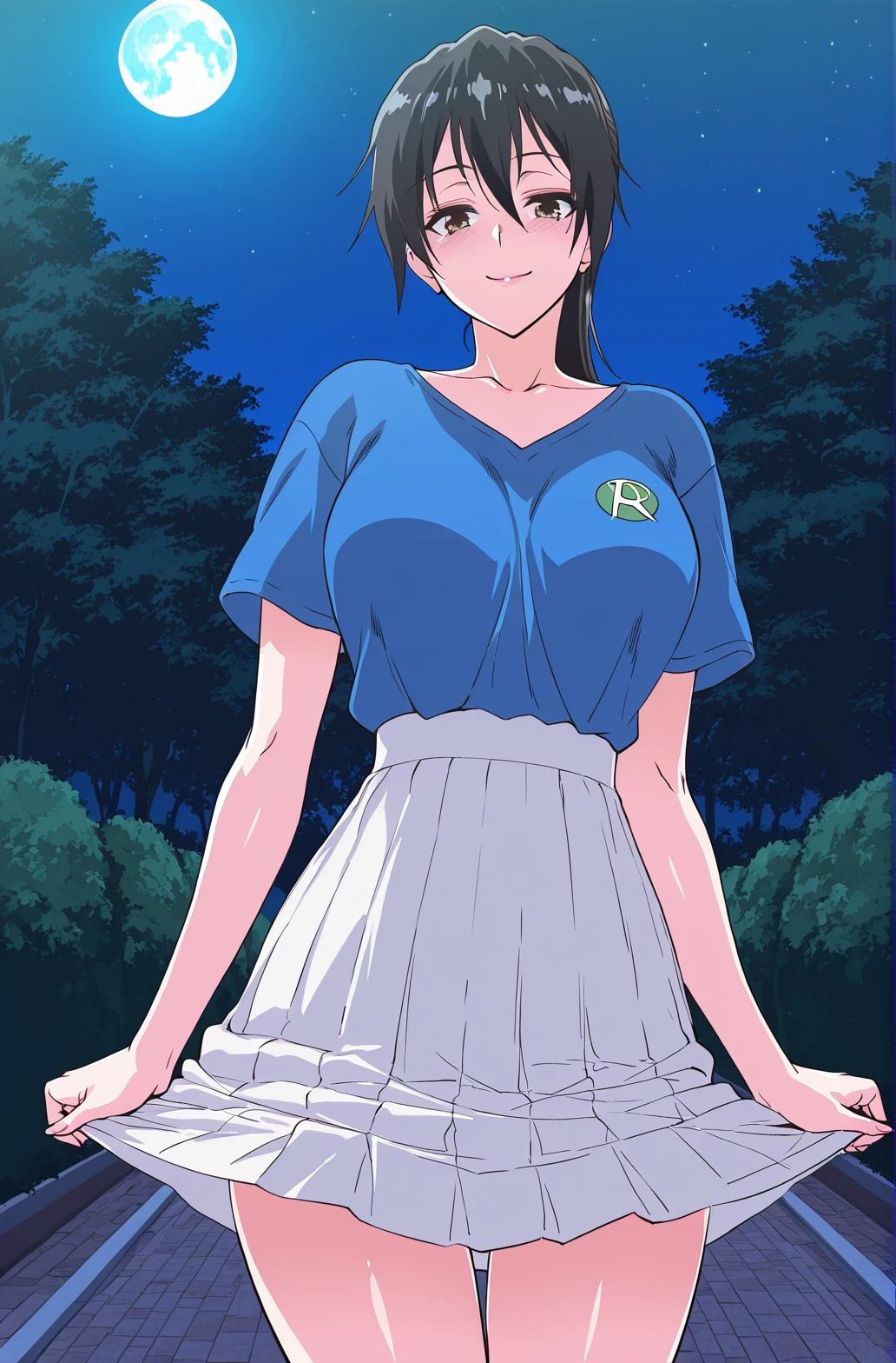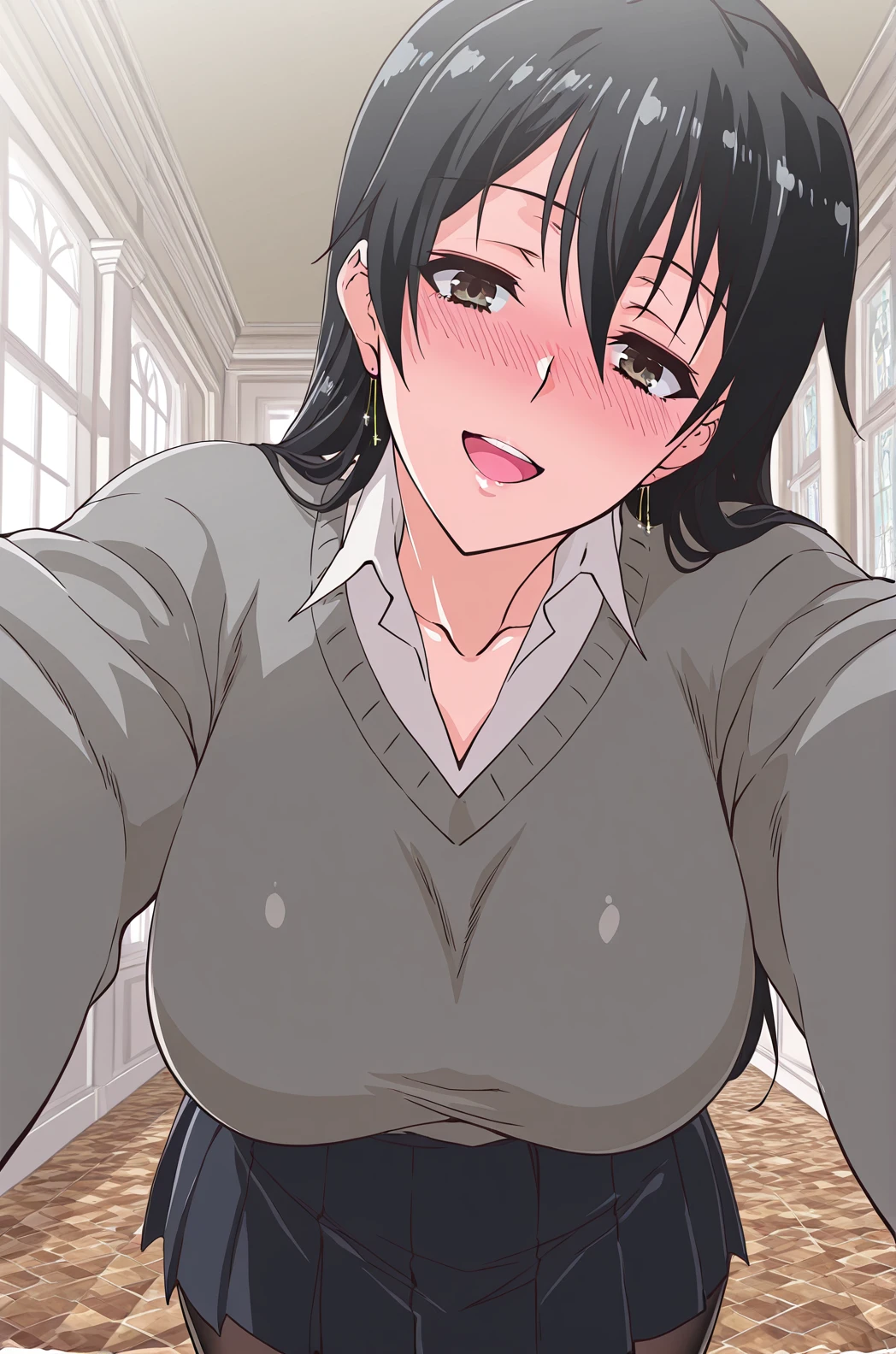 Seohyun, 1girl, solo, brown eyes, black hair, medium hair, irregular bangs, hair between eyes, mid ponytail, hair tied back,