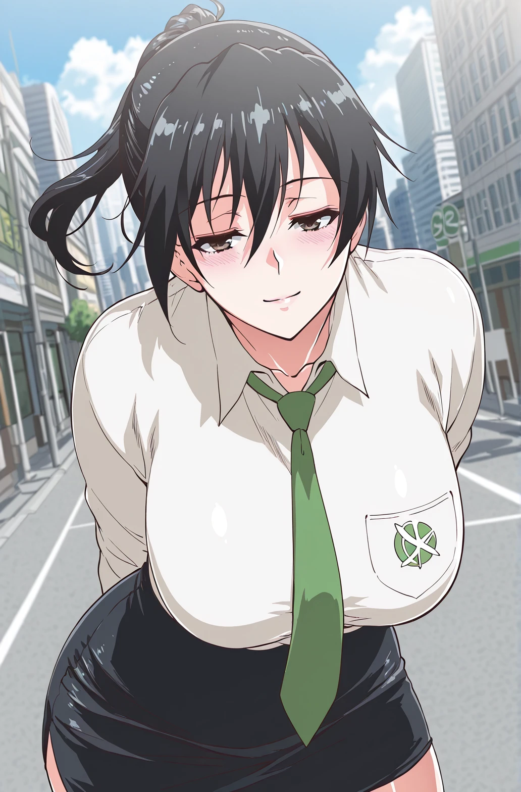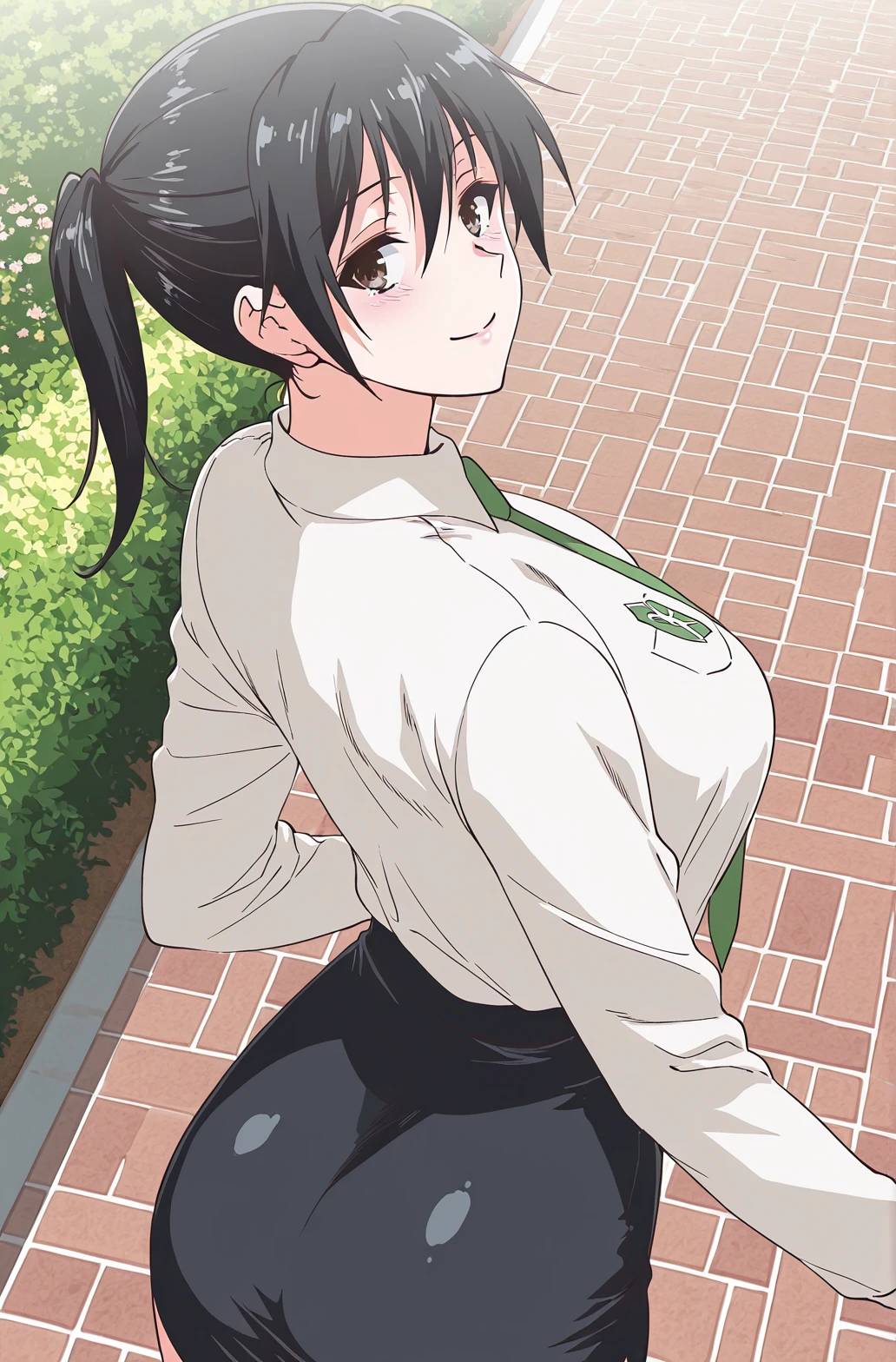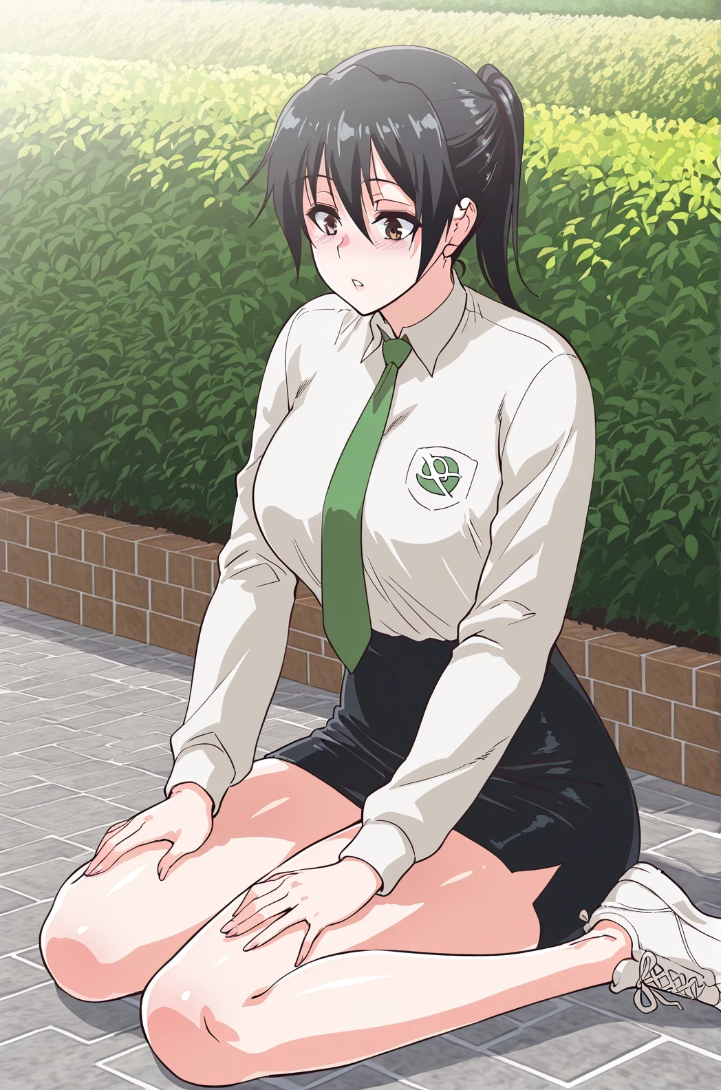 Seohyun_outfit1, white shirt, long sleeves, green tie, dark skirt, pencil skirt, short skirt, white sneakers,