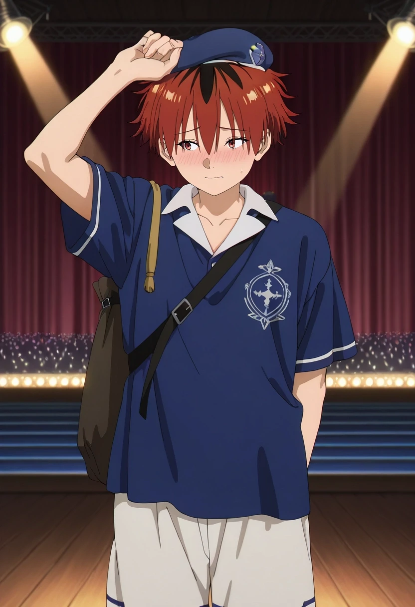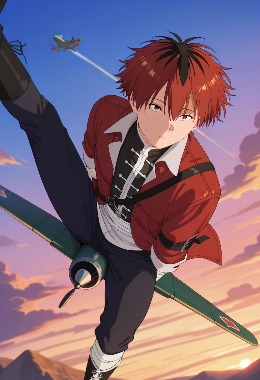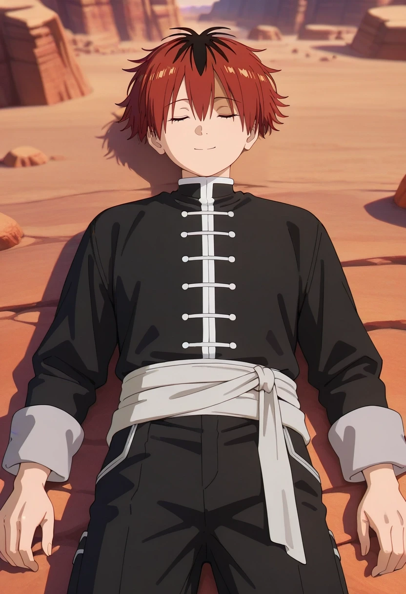 stark_sousou_no_frieren, red hair, red eyes, short hair, bangs, hair between eyes, multicolored hair, two-tone hair, black hair