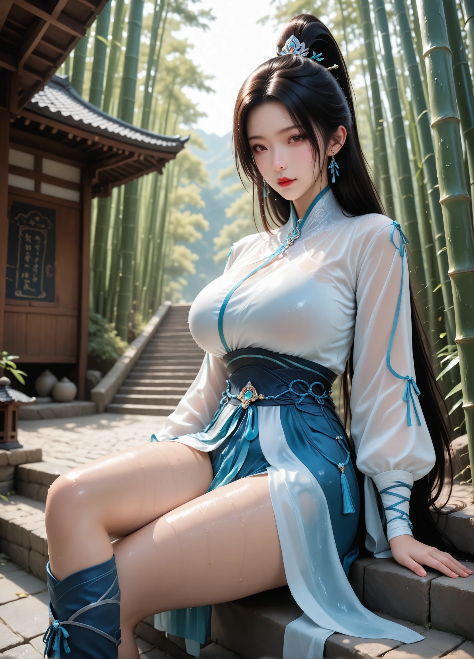 ningyao, layered hanfu, gradient blue fabric, sheer flowing skirt, embroidered patterns, wide sleeves, dark blue waist sash, tassel decoration, blue boots with embroidery,high topknot, long black hair, floating light blue ribbons, hairpin ,calm expression, ethereal demeanor, graceful posture,3d render,