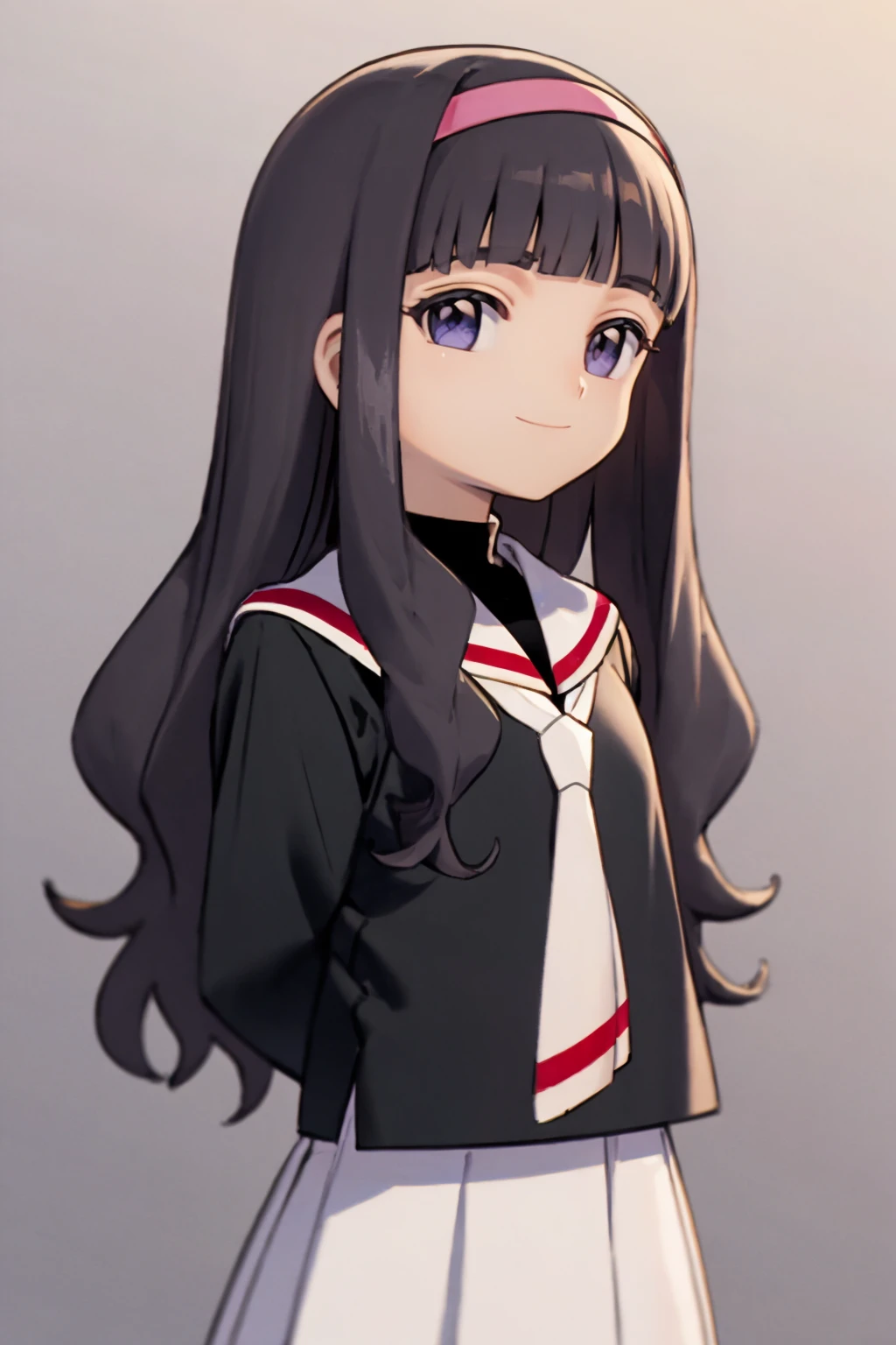 1girl, daidouji tomoyo, black hair, long hair, blunt bangs, hairband, long hair, purple eyes
