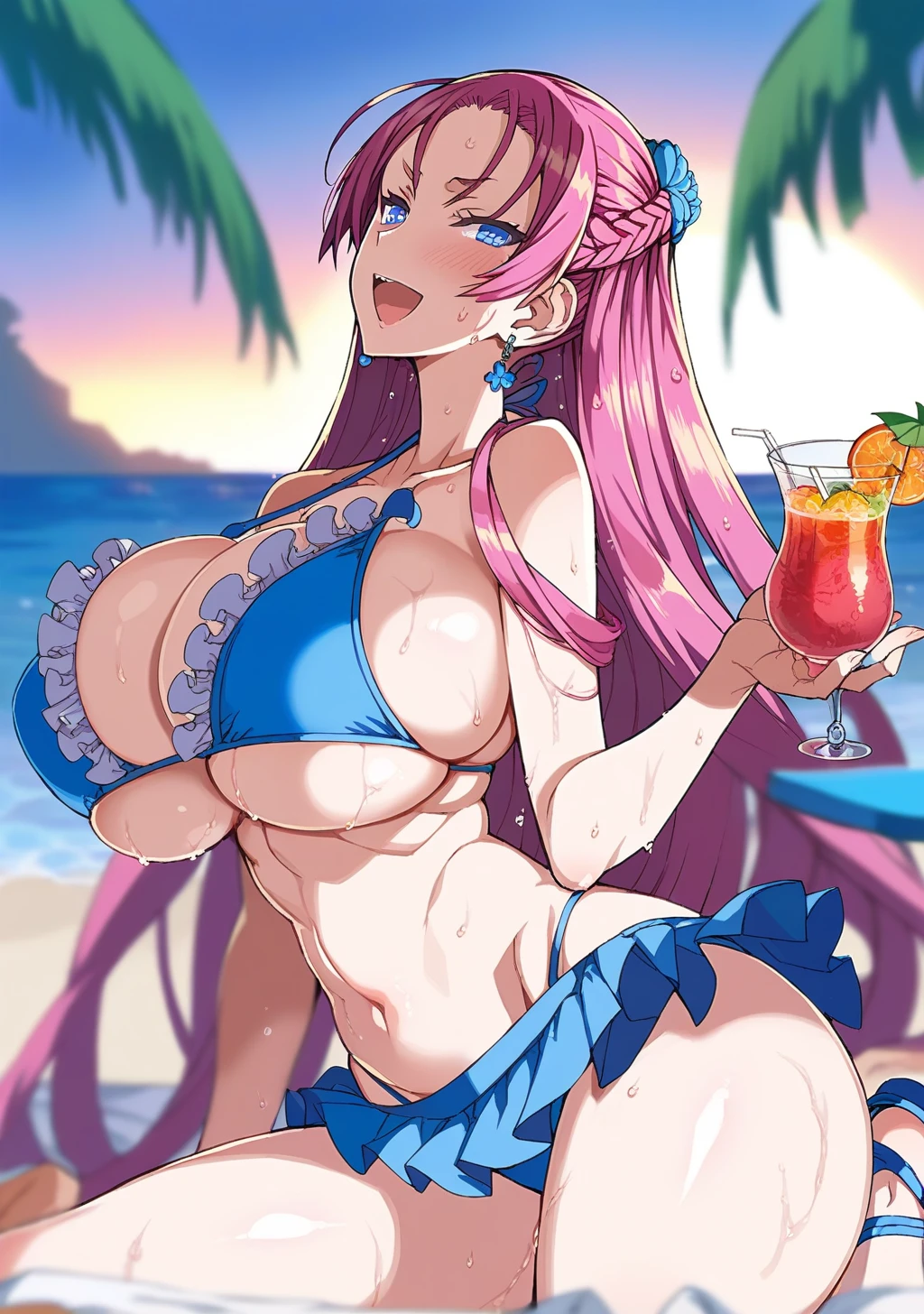 "hair flower,blue bikini,frilled bikini, bikini skirt,strap gap,frills, blush,sandals"