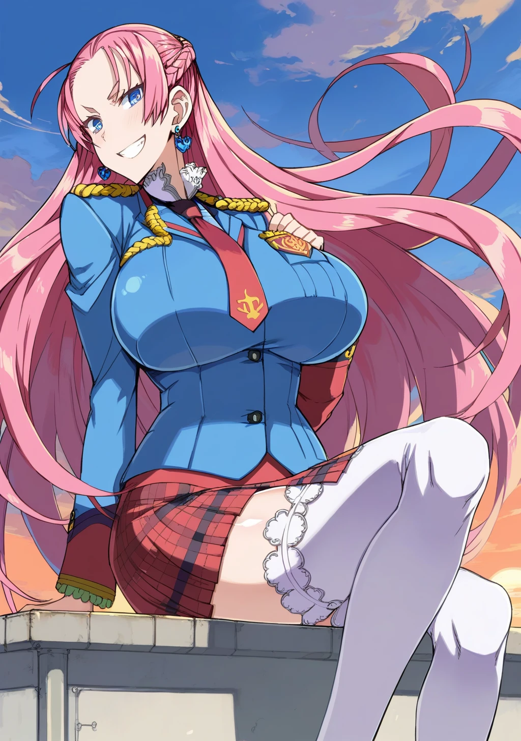 blue uniform, plaid skirt,white thighhighs,jewelry,earrings,necktie,zettai ryouiki