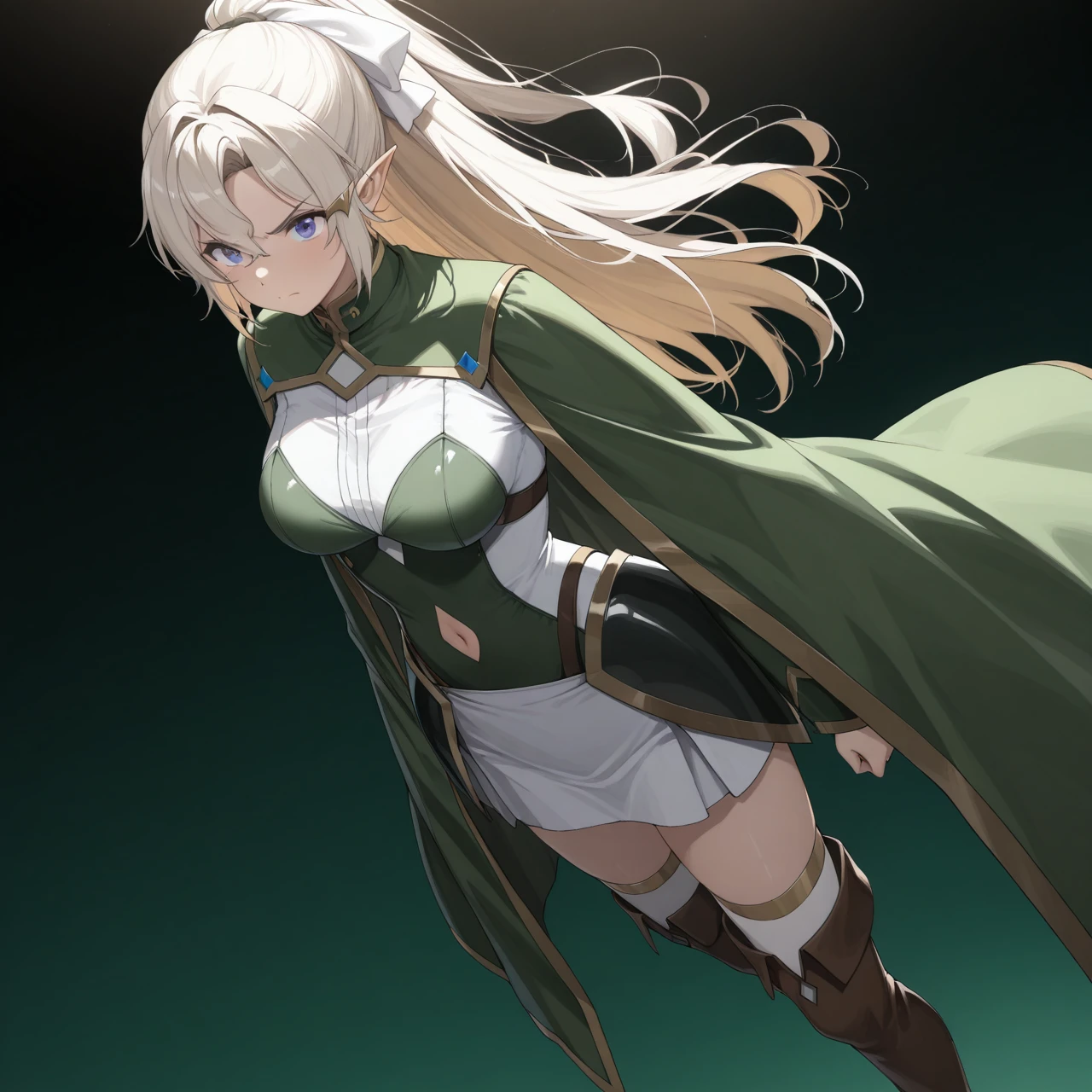 Dress: (white shirt green pattern), long sleeves, shoulder cutouts, white skirt, navel cutout, cloak, thighhighs, brown boots