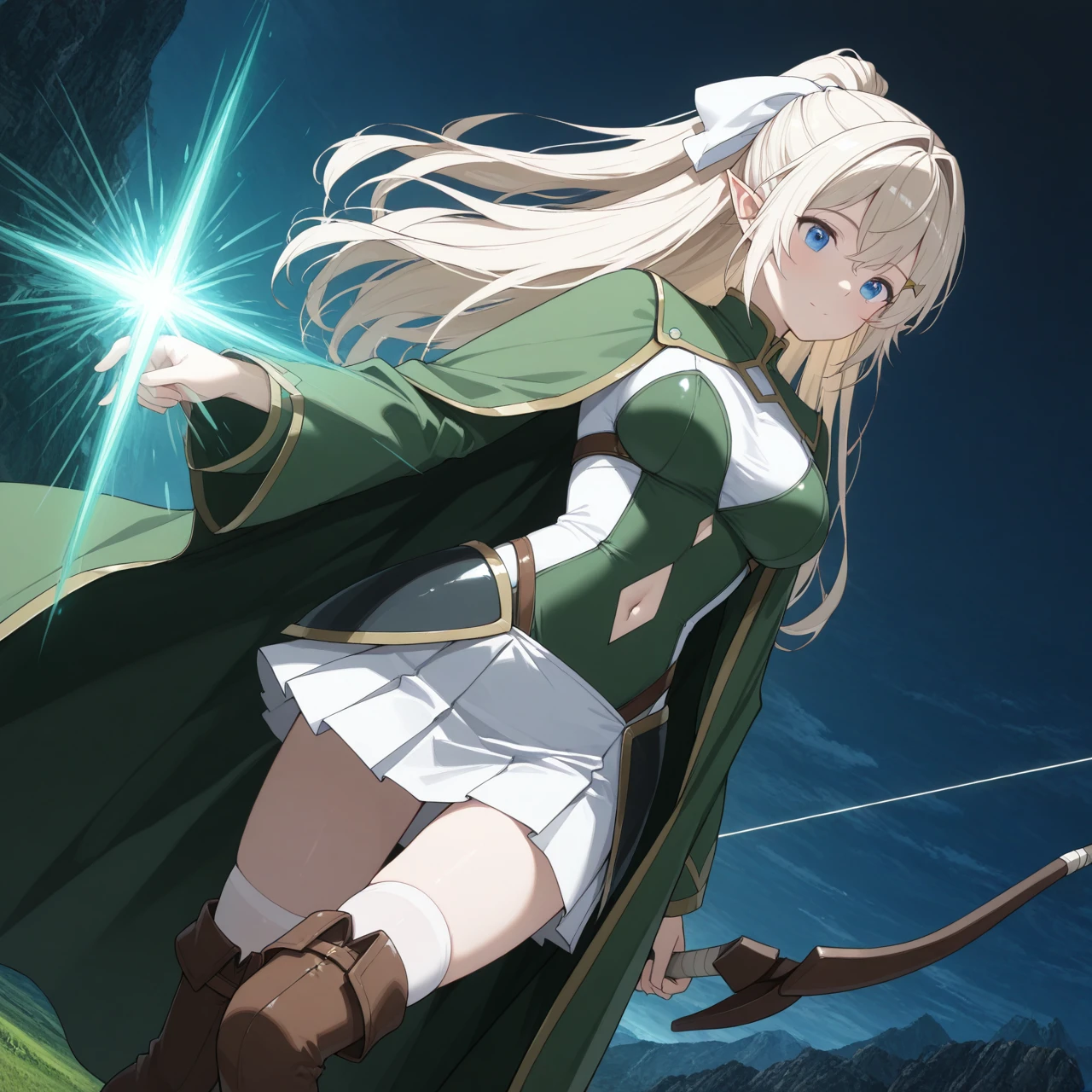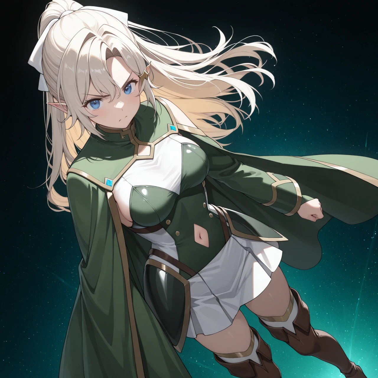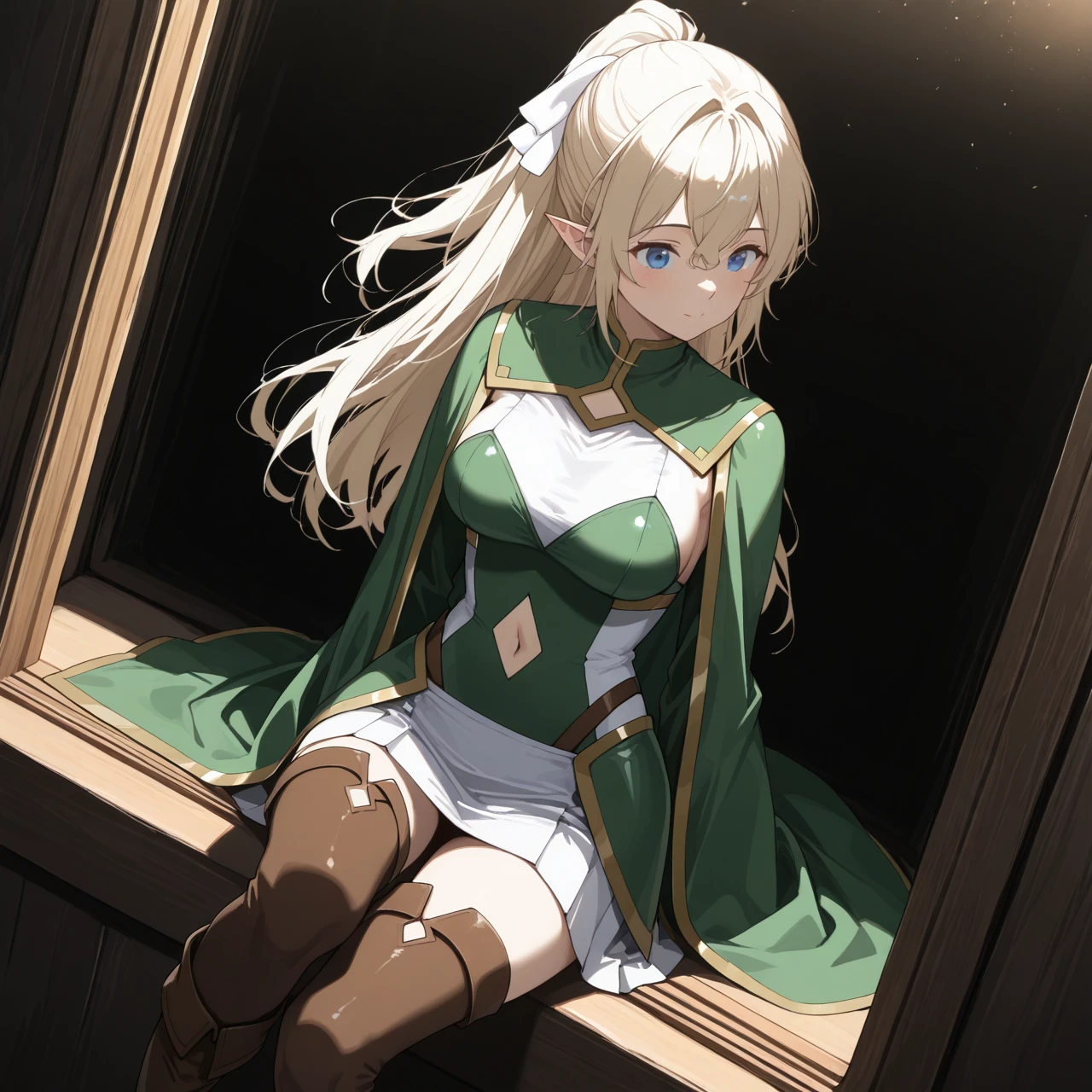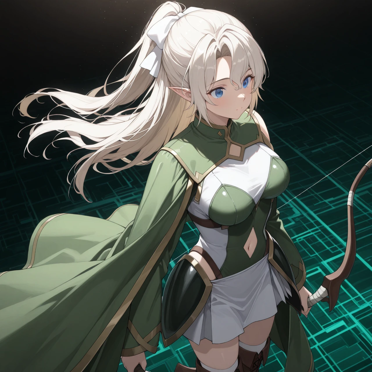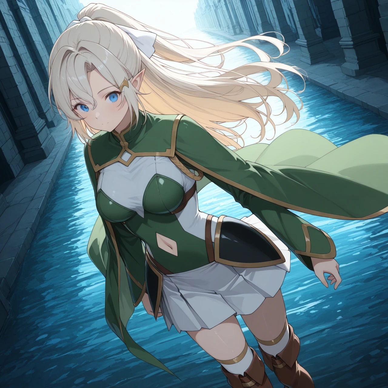Character: (SashaMugenGacha, pointy ears, blue eyes, blond hair, long hair, high ponytail, white hair ribbon)