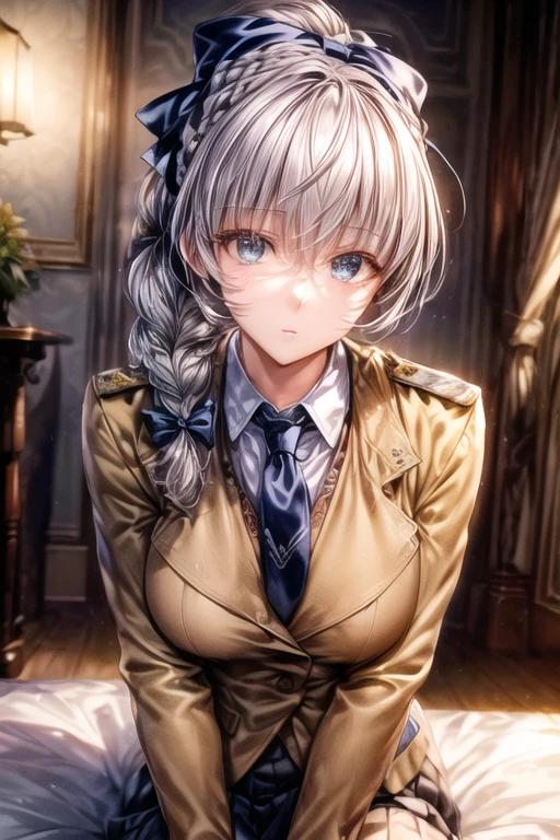 Trigger word: teletha_a, grey hair, braided ponytail, single braid, hair bow, blue bow, grey eyes, black necktie, military uniform, long sleeves, white shirt, brown skirt,