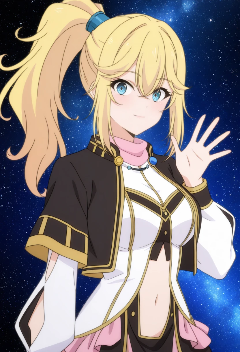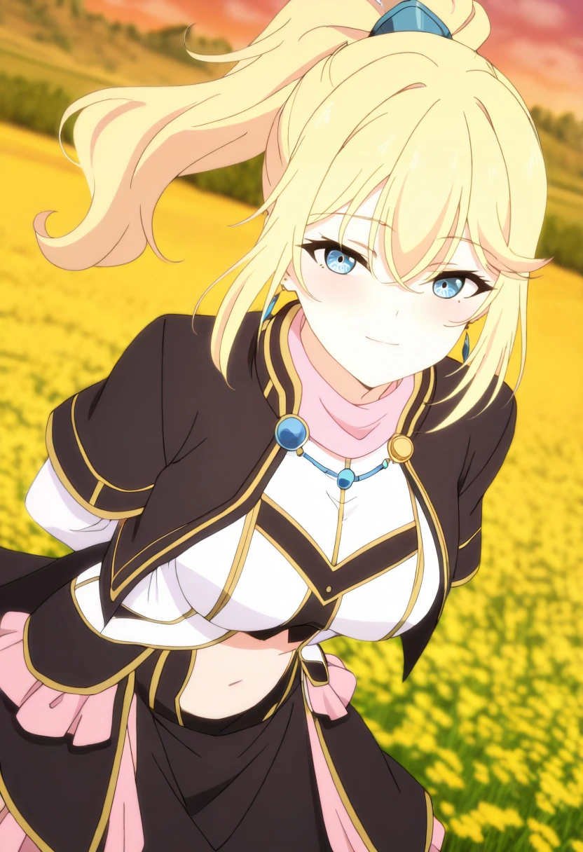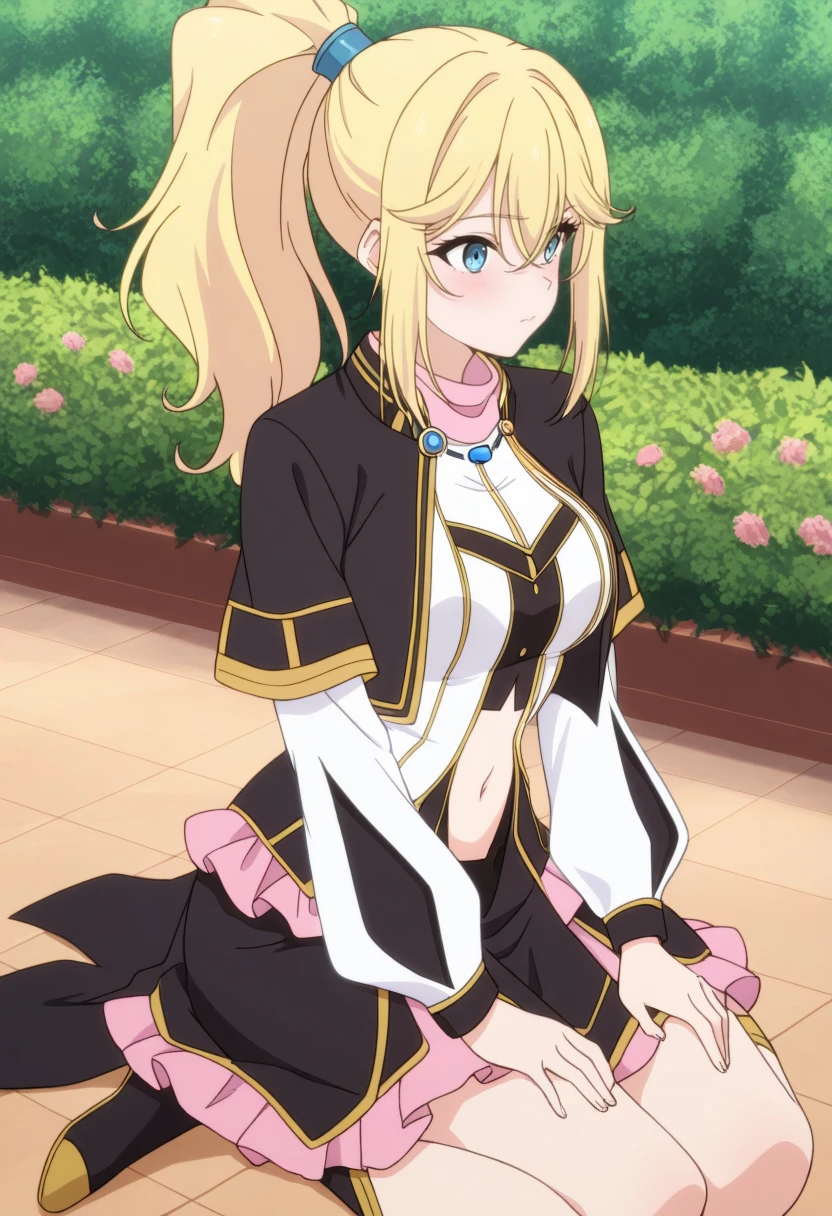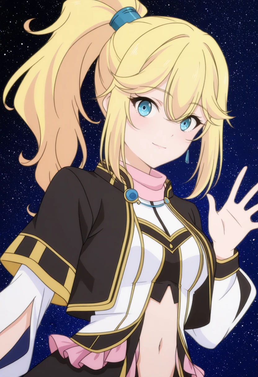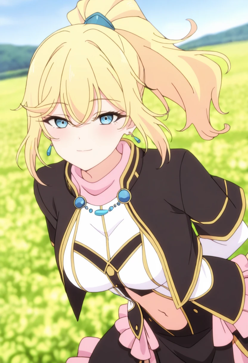 1girl,blonde hair,long hair,ponytail,blue eyes,bare midriff,cleavage,detached sleeves,frilled dress,jewelry,necklace,black jacket,black capelet,pink frills,pink collar,navel cutout black skirt,white shirt