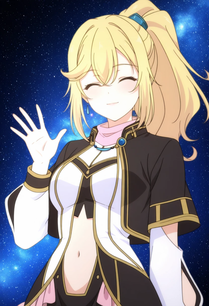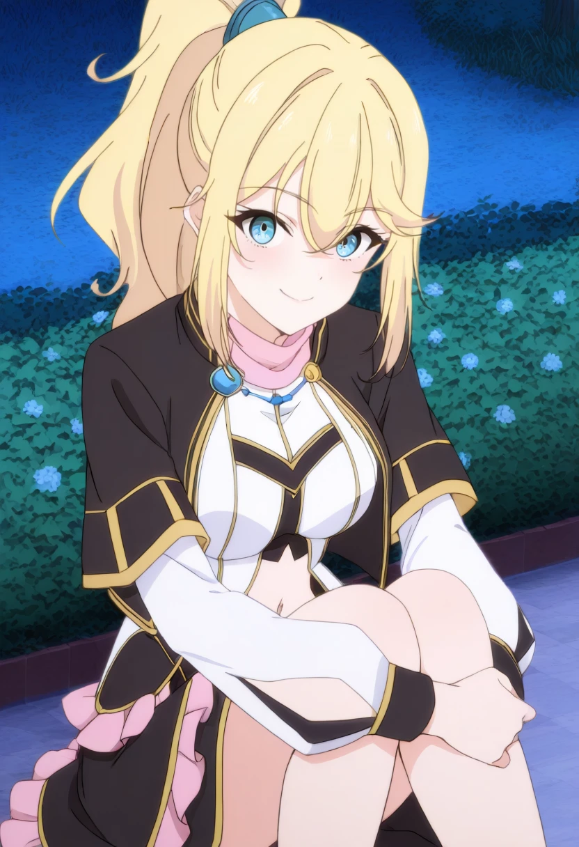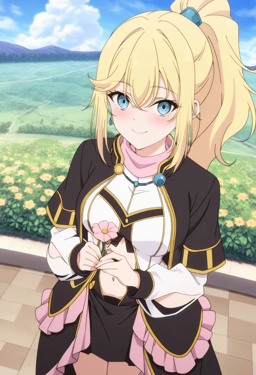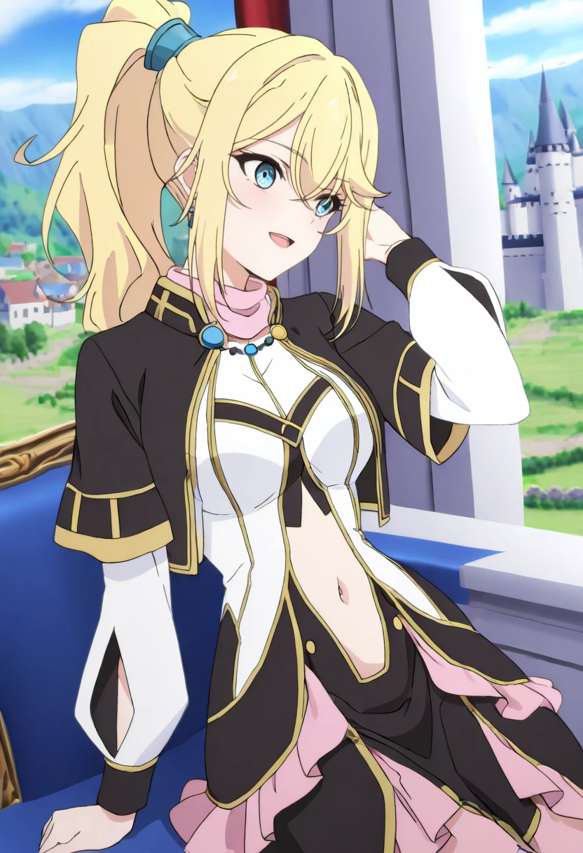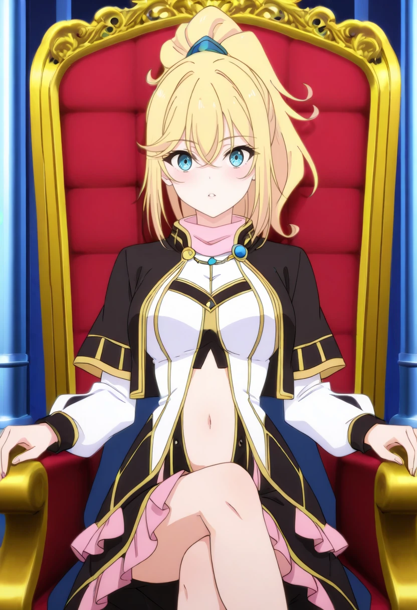 1girl,blonde hair,long hair,ponytail,blue eyes,bare midriff,cleavage,detached sleeves,frilled dress,jewelry,necklace,black jacket,black capelet,pink frills,pink collar,navel cutout black skirt,white shirt