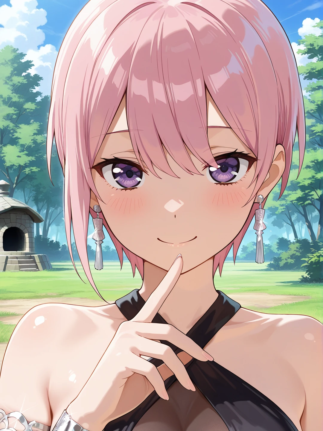 short hair,pink hair,earrings,purple eyes