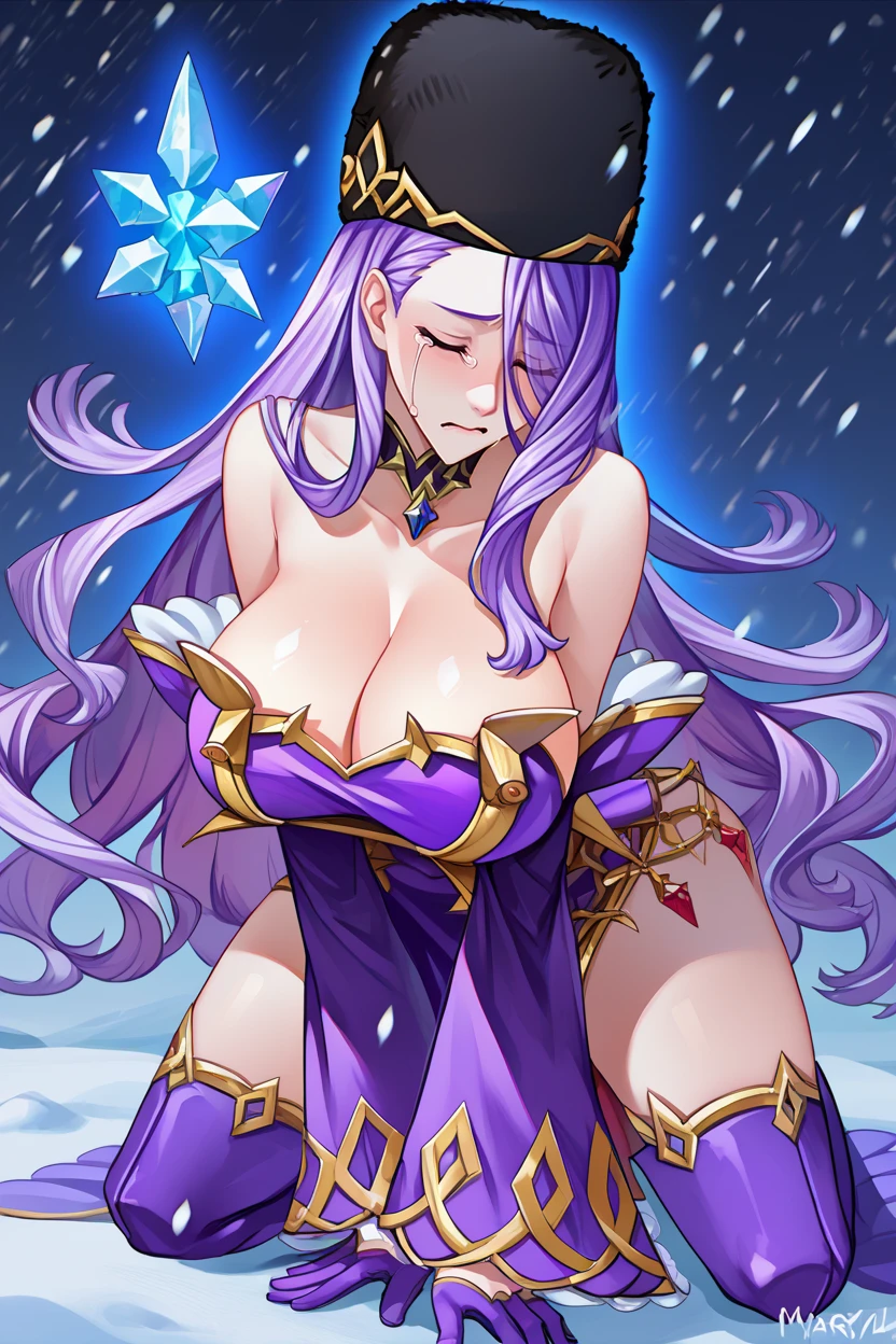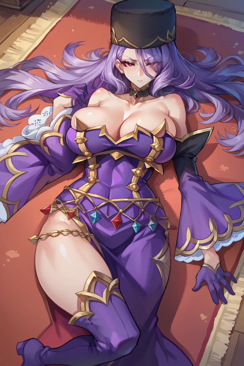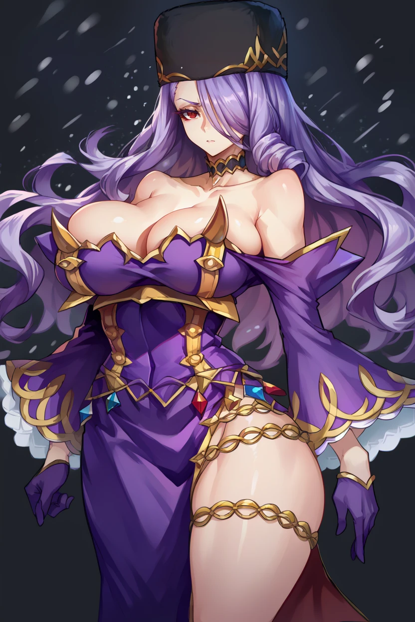choker, fur hat, bare shoulders, purple dress, detached sleeves, purple gloves, thigh boots