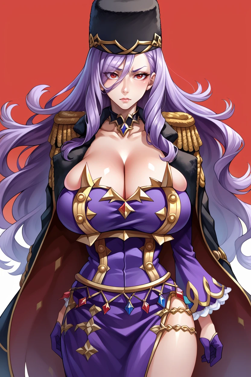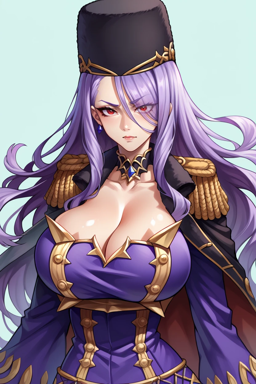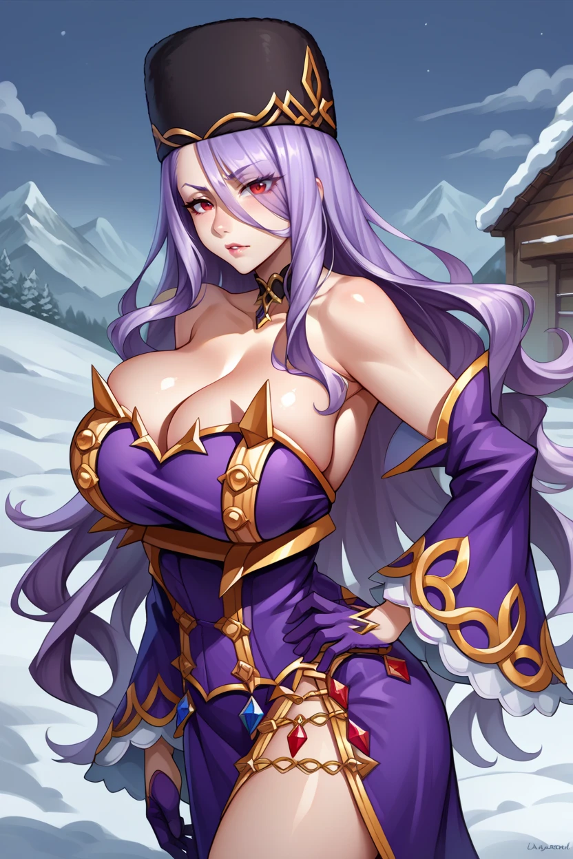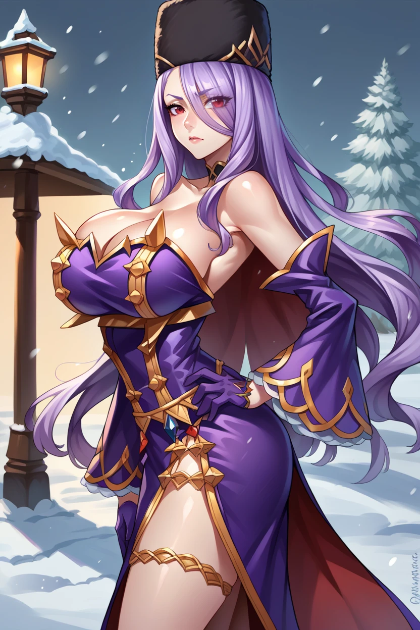 Add "hair over one eye, choker, fur hat, jacket on shoulders, epaulettes, purple dress, detached sleeves, purple gloves, thigh boots" for her typical look. The jacket on shoulders is pretty inconsistent.