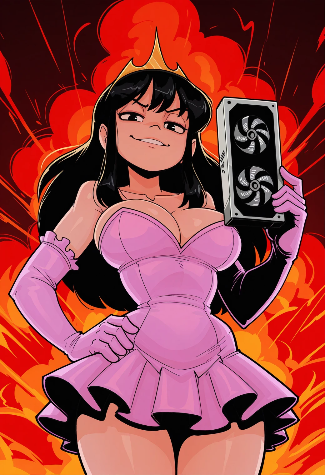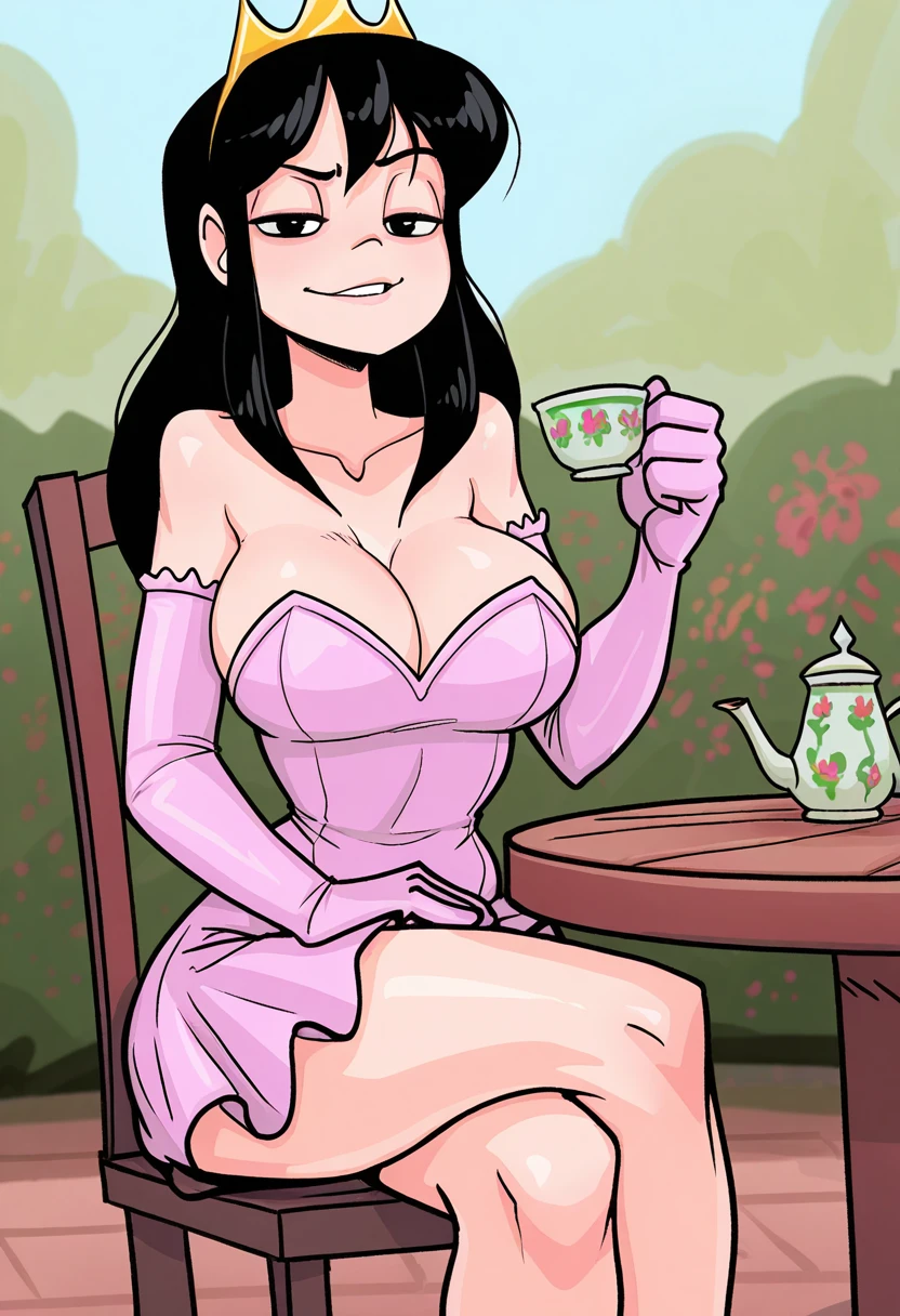 Outfit: crown, pink dress, strapless dress, bare shoulders, cleavage, elbow gloves, pink sneakers, socks with pink stripe,