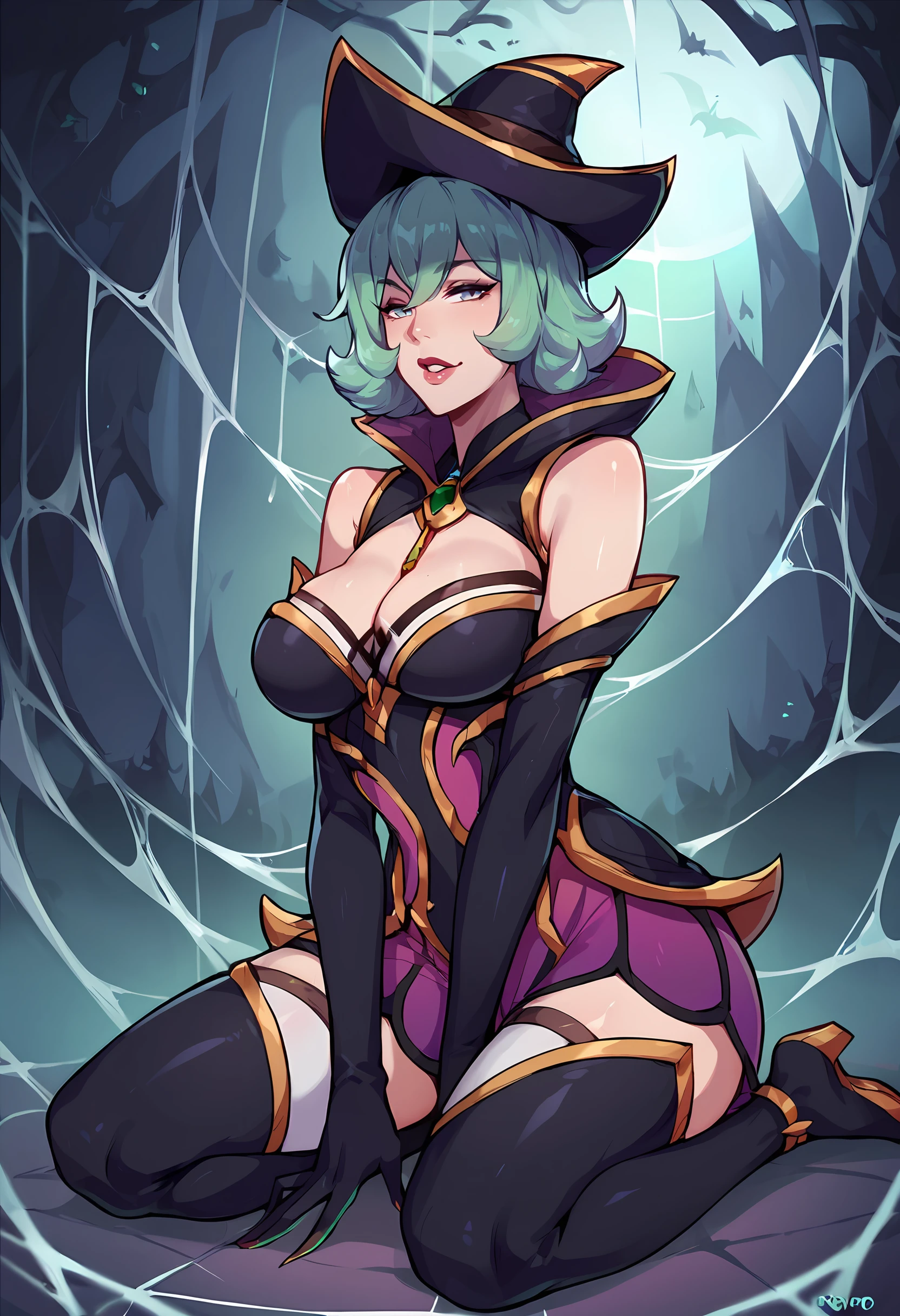 bewitchingelisexl, witch hat, thighhighs, elbow gloves, green hair, dress, bare shoulders