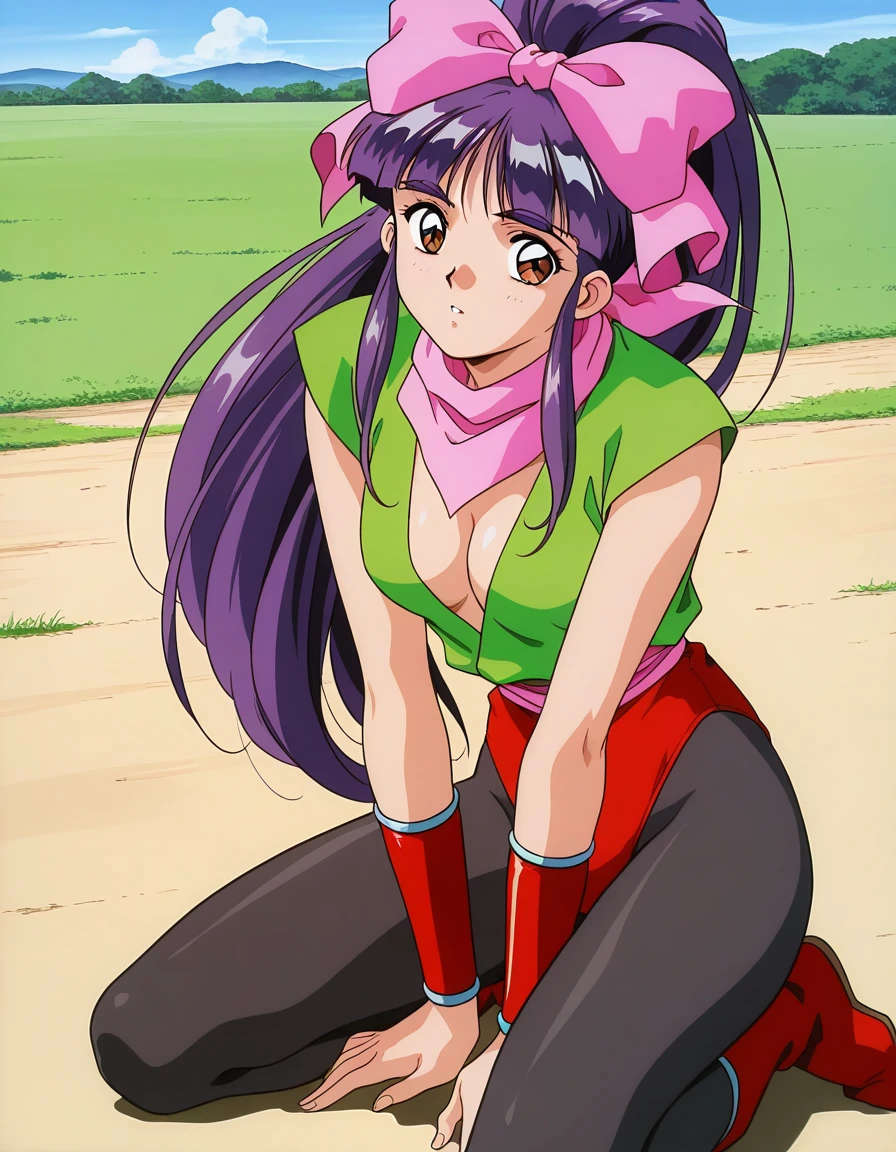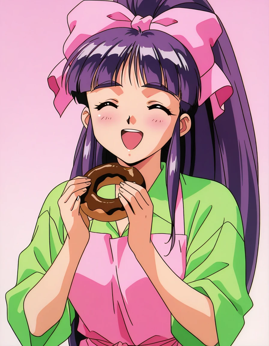 Midou_Miko, 1girl,solo, pink bow, purple hair, long hair, hair bow, brown eyes, ponytail, bangs, hair ribbon, large breasts,1990s (style), anime coloring,