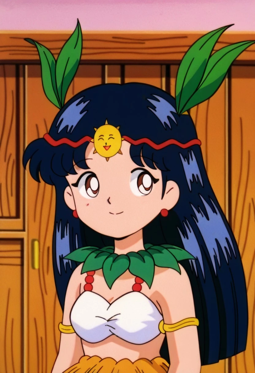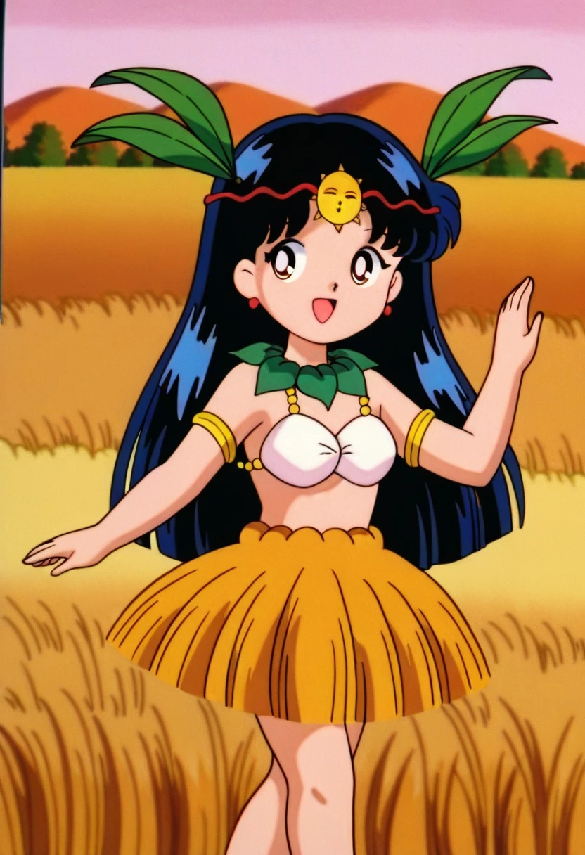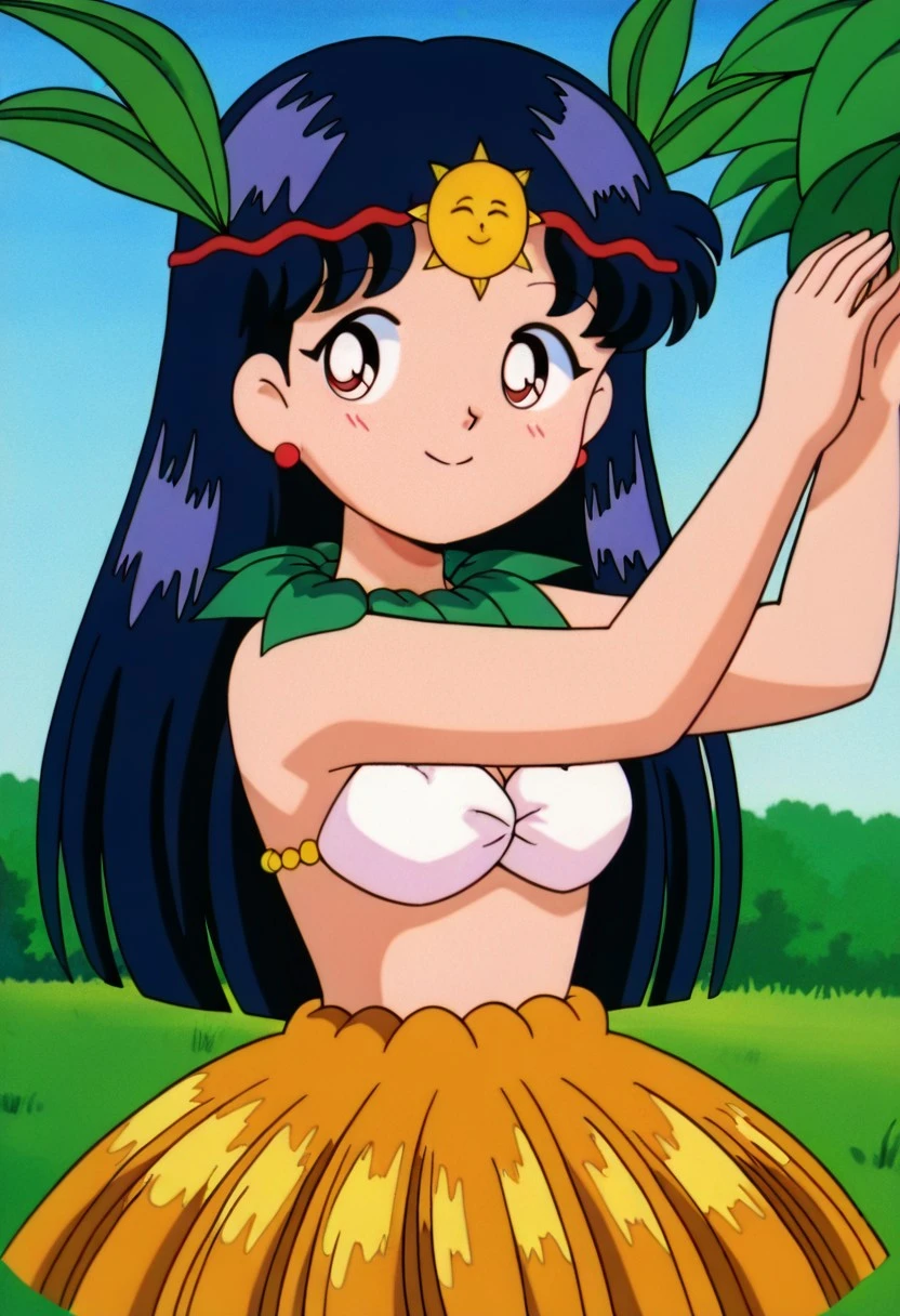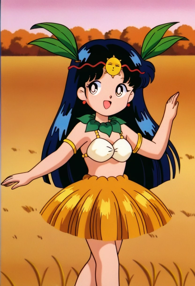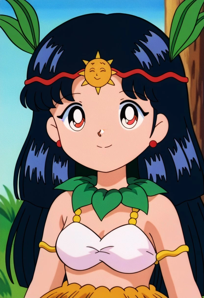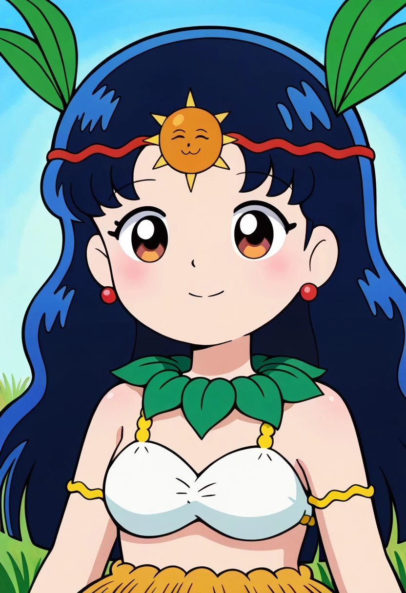femkitaguruguru A, black hair, large hime cut, navy blue hair, red earring, sun forehead ornament, red headband, green leaf necklace, blue highlights, white bra, green leaf collar, short grass skirt, cute, short stature, leaf hair ornaments, barefoot