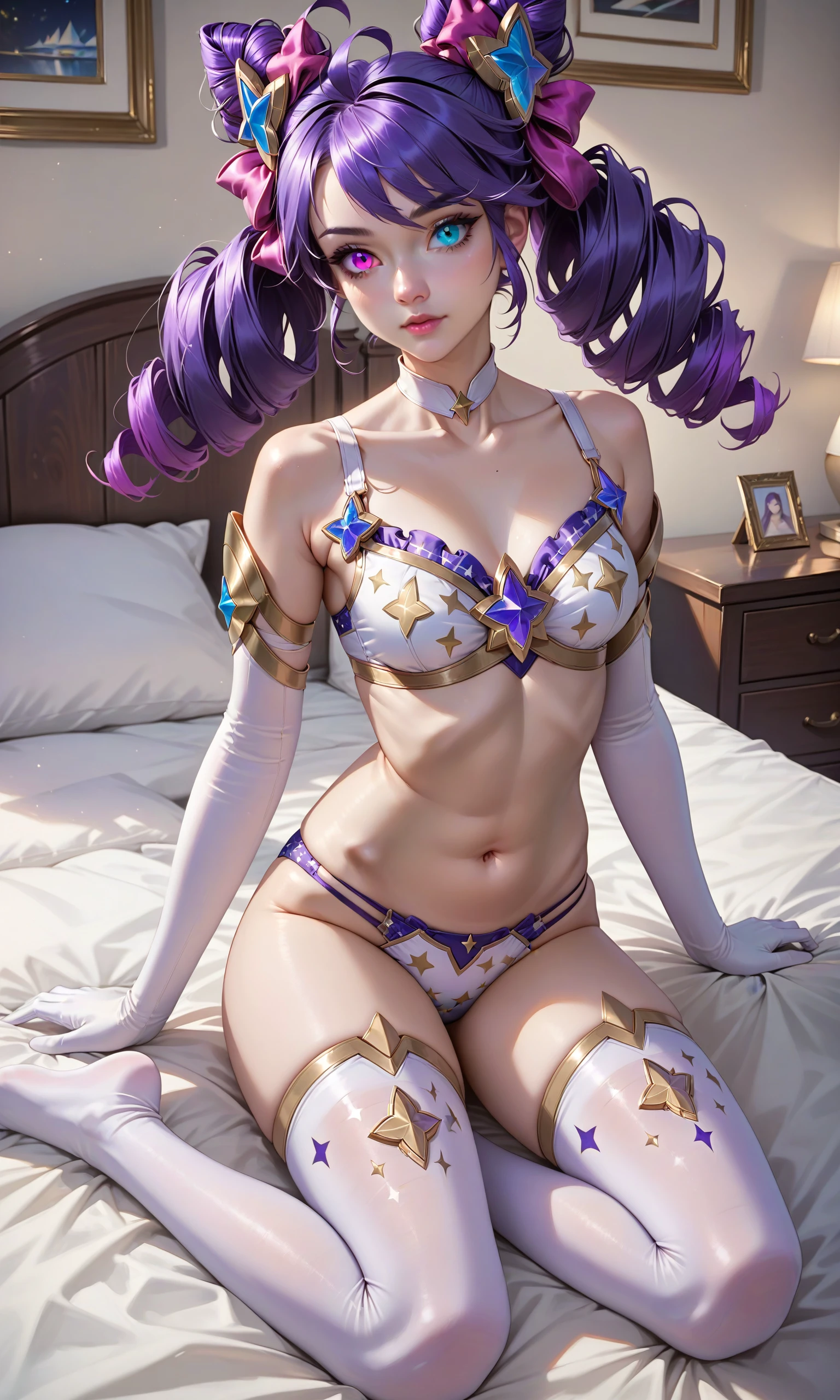 <lora:SGGwenSDXL:0.75>, (star guardian gwen, thighhighs, purple hair, (heterochromia:1.4), long hair, elbow gloves, twintails, drill hair, twin drills, purple skirt, white dress, cone hair bun, high heels), outdoors, (crossed arms:1.5), (sitting on rock:1.5), night, forest, midnight, 1am, moon,