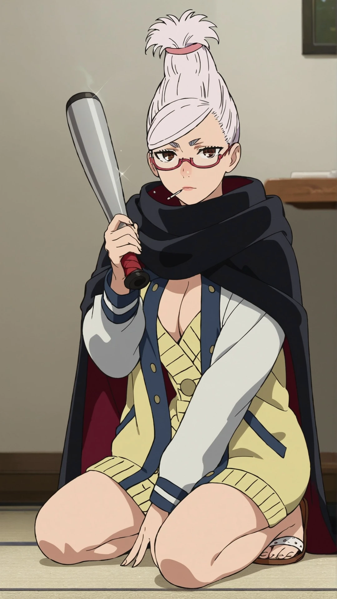 seiko_ayase, an anime girl, 1girl, solo, breasts, looking at viewer, simple background, white background, holding, cleavage, brown eyes, jacket, full body, white hair, glasses, sweater, sandals, semi-rimless eyewear, red-framed eyewear, under-rim eyewear, baseball bat, letterman jacket