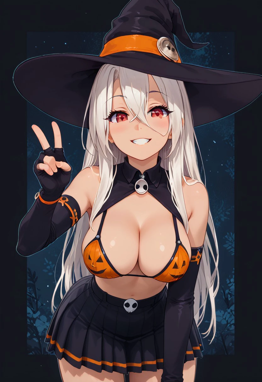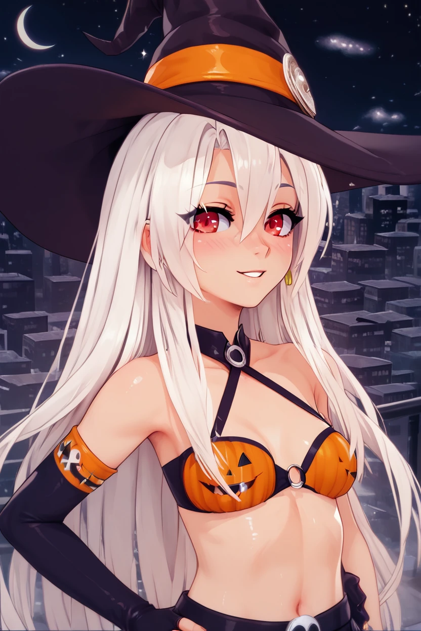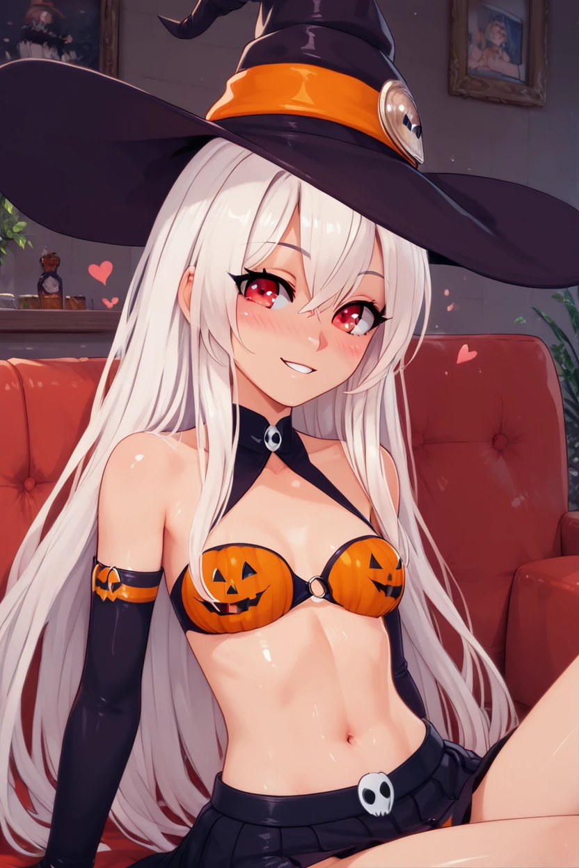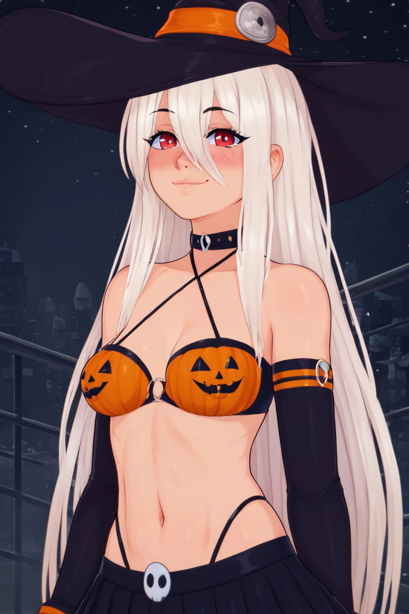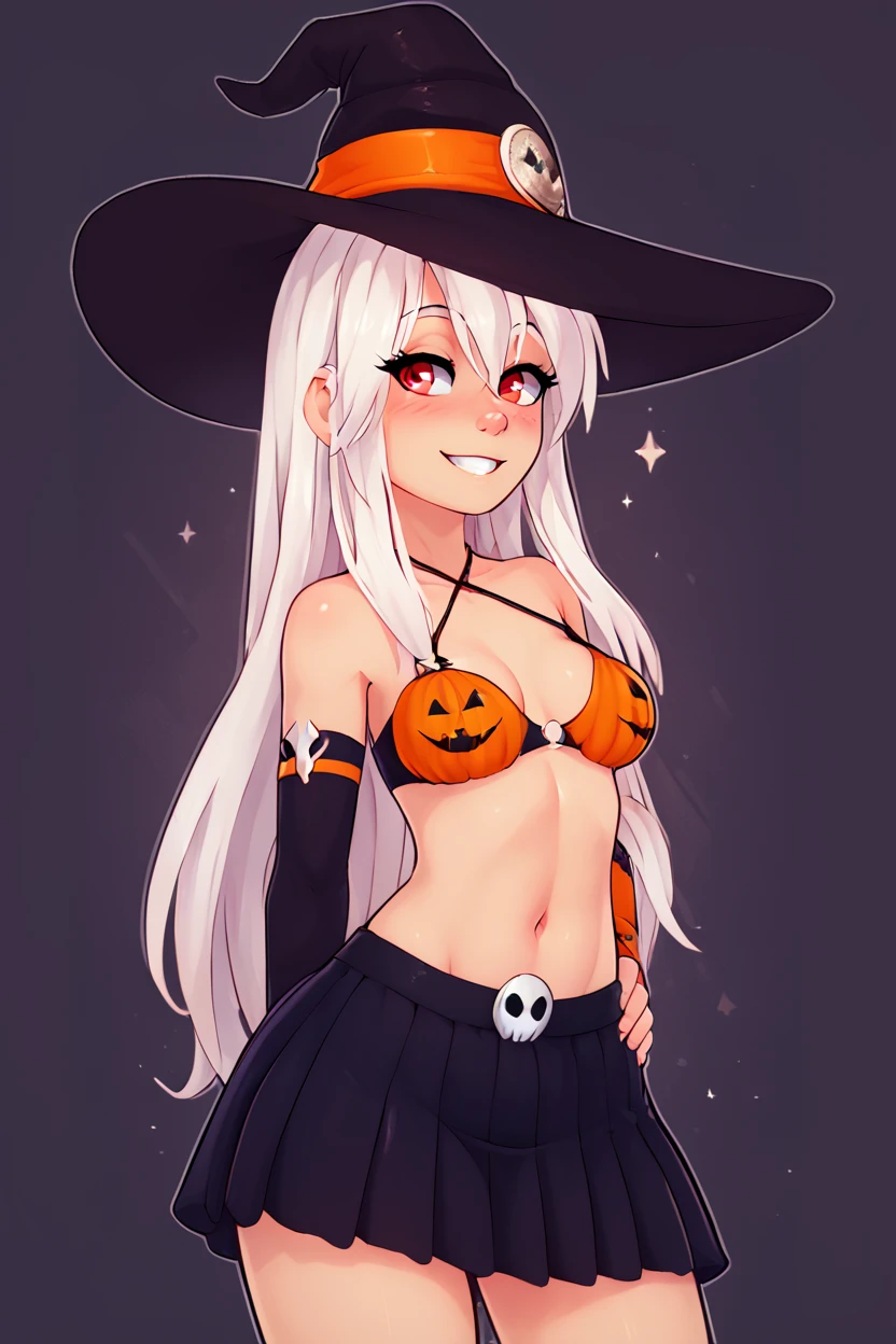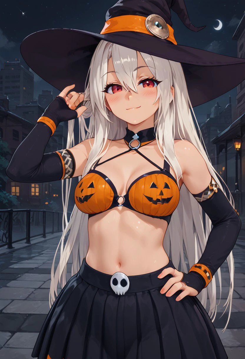 zzPumpkinIllyaCitron, hair between eyes, red eyes, long hair, very long hair, white hair, witch hat, elbow gloves, navel, black skirt, halloween costume, bikini top only,