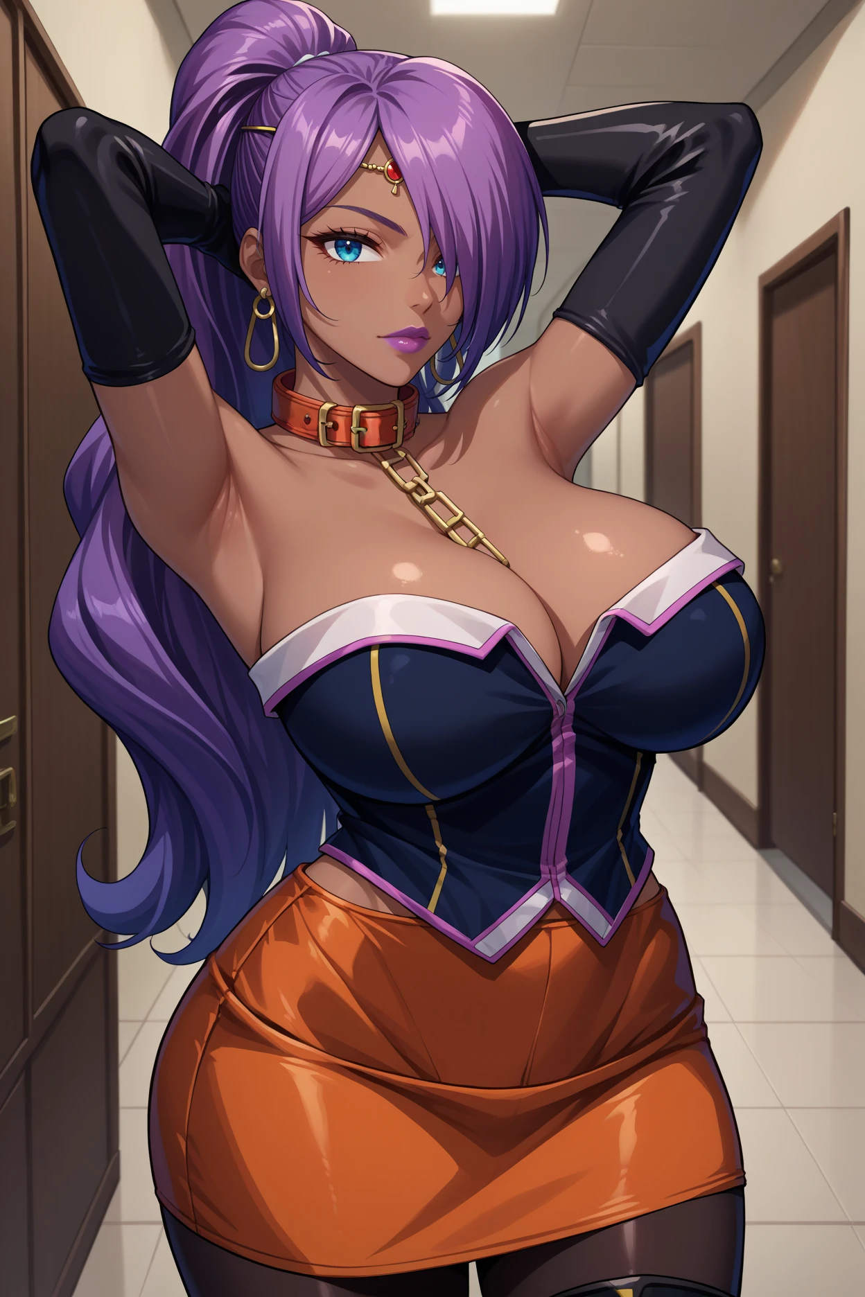 Add "earrings, circlet, red collar, black shirt, strapless shirt, cleavage, elbow gloves, black gloves, orange skirt, black thigh boots" for her typical look.
